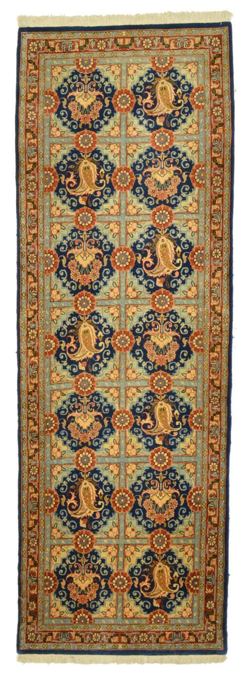 Ghom ist eine traditionsreiche, zentralperische Stadt in der Nähe von Teheran – bekannt auch als die heilige Stadt. Ghom Teppiche zählen zu den erlesensten und feinsten Knüpferzeugnissen Persiens und werden durchwegs von langjährig geschulten MeisterknüpferInnen gefertigt. Die Motivwelten entspringen dabei vor allem der hochklassigen Architektur Persiens – so verleihen Ghoms jedem Raum eine besonders edle Note.