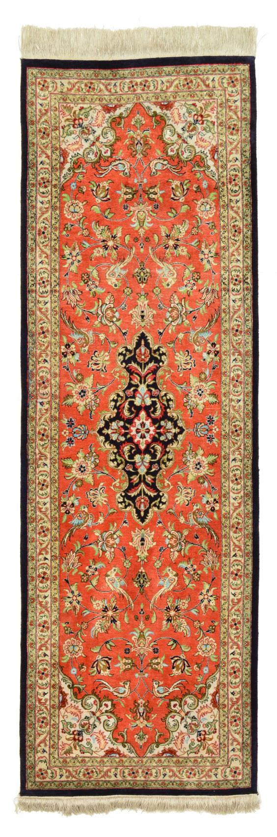 Ghom ist eine traditionsreiche, zentralperische Stadt in der Nähe von Teheran – bekannt auch als die heilige Stadt. Großen Ruhm haben speziell die Stücke aus Seide erlangt. Sie zählen zu den erlesensten und feinsten Knüpferzeugnissen der Welt und werden von langjährig geschulten MeisterknüpferInnen gefertigt. Die Motivwelten entspringen dabei vor allem der hochklassigen Architektur Persiens – so verleihen Ghoms jedem Raum eine besonders edle Note.