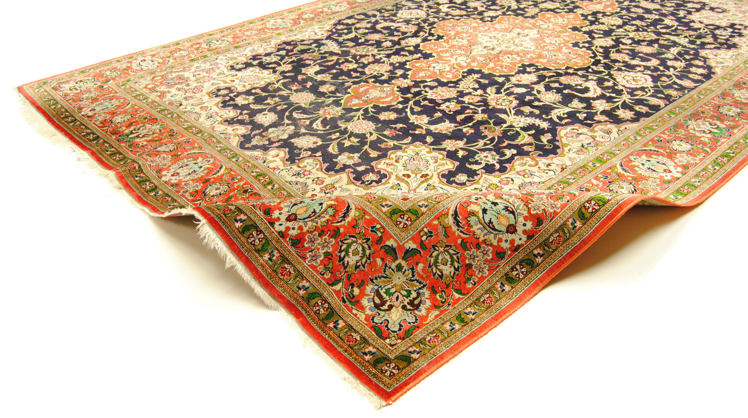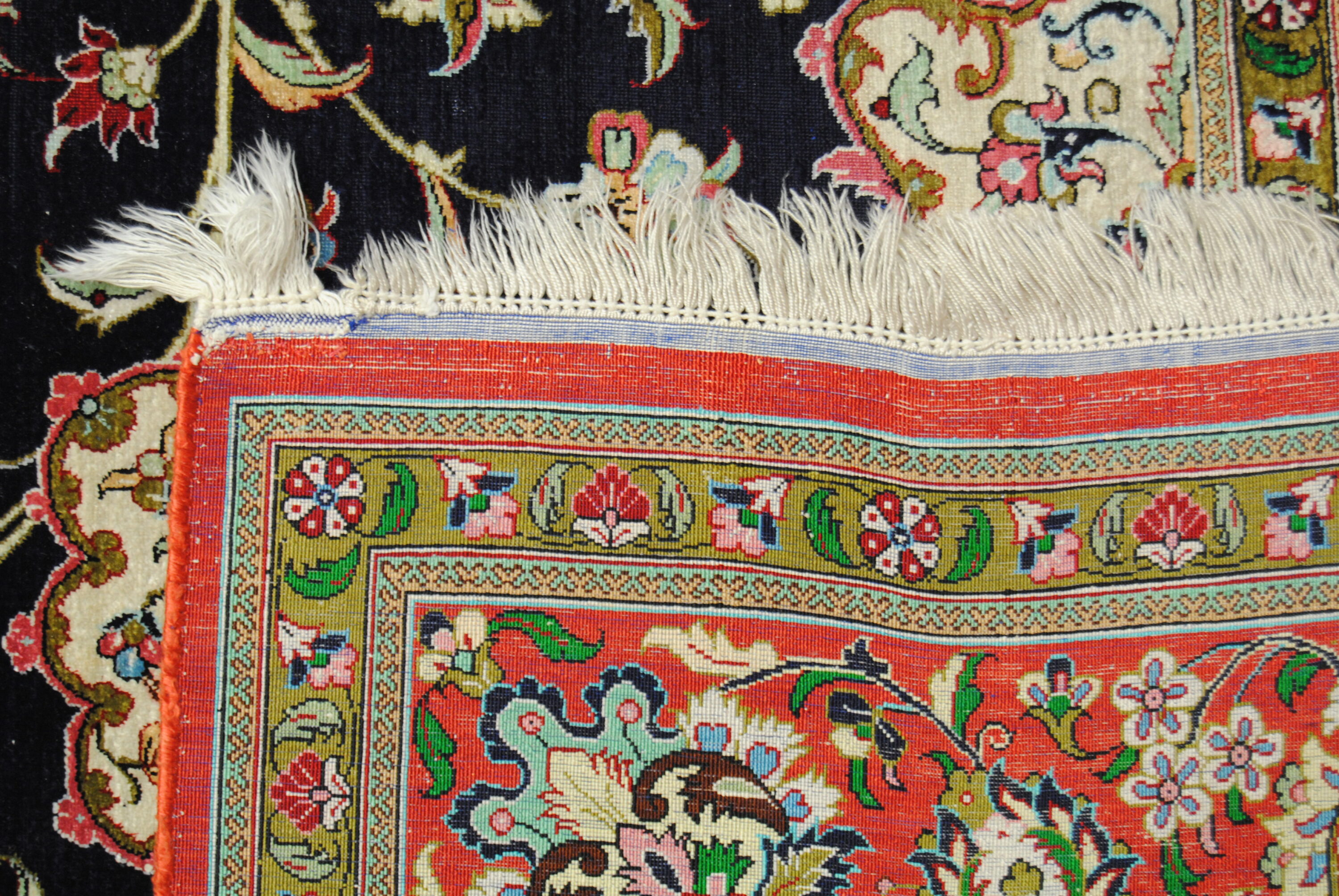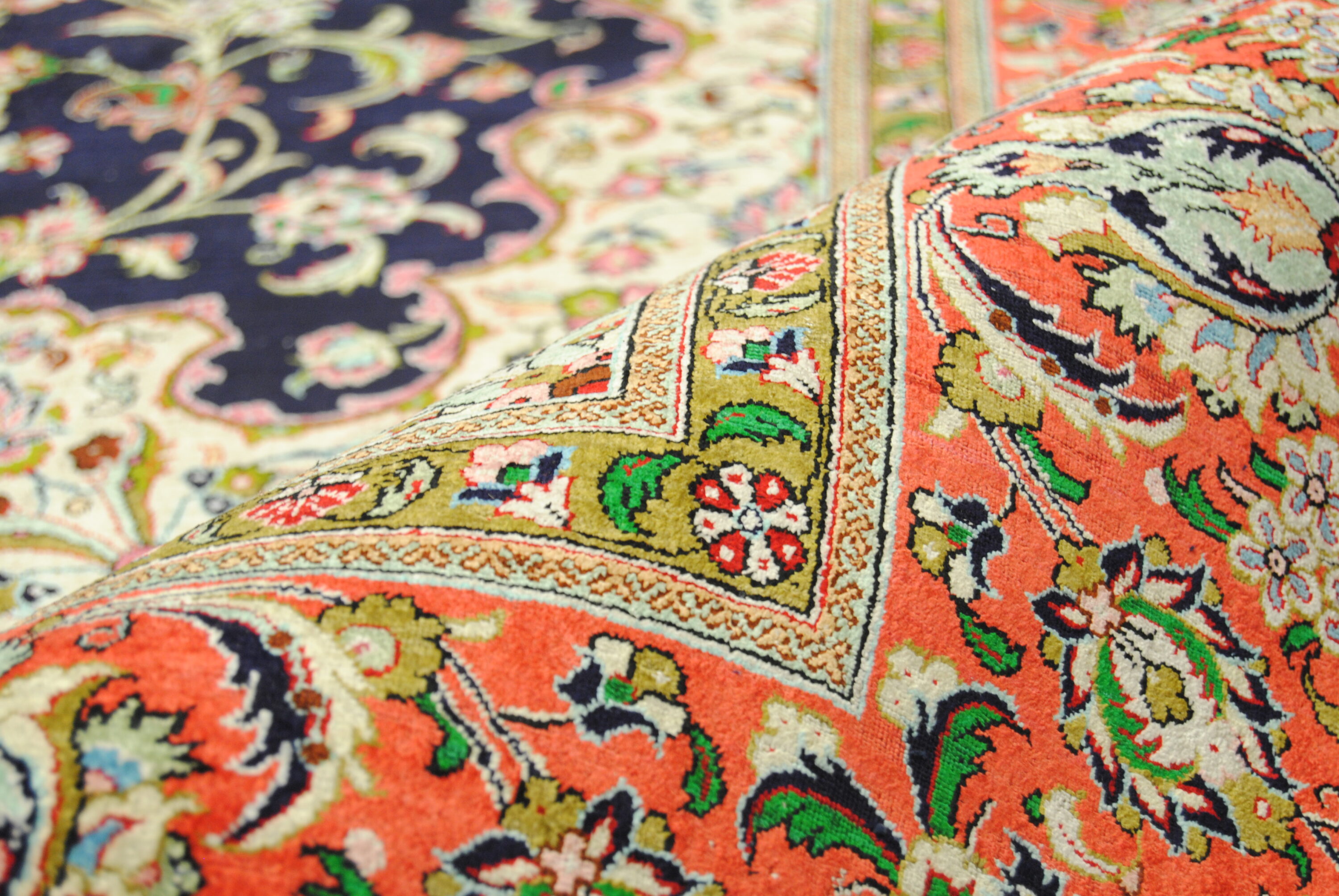 Ghom ist eine traditionsreiche, zentralperische Stadt in der Nähe von Teheran – bekannt auch als die heilige Stadt. Großen Ruhm haben speziell die Stücke aus Seide erlangt. Sie zählen zu den erlesensten und feinsten Knüpferzeugnissen der Welt und werden von langjährig geschulten MeisterknüpferInnen gefertigt. Die Motivwelten entspringen dabei vor allem der hochklassigen Architektur Persiens – so verleihen Ghoms jedem Raum eine besonders edle Note. Es handelt sich um einen Eintausch-Teppich (abgetreten) !