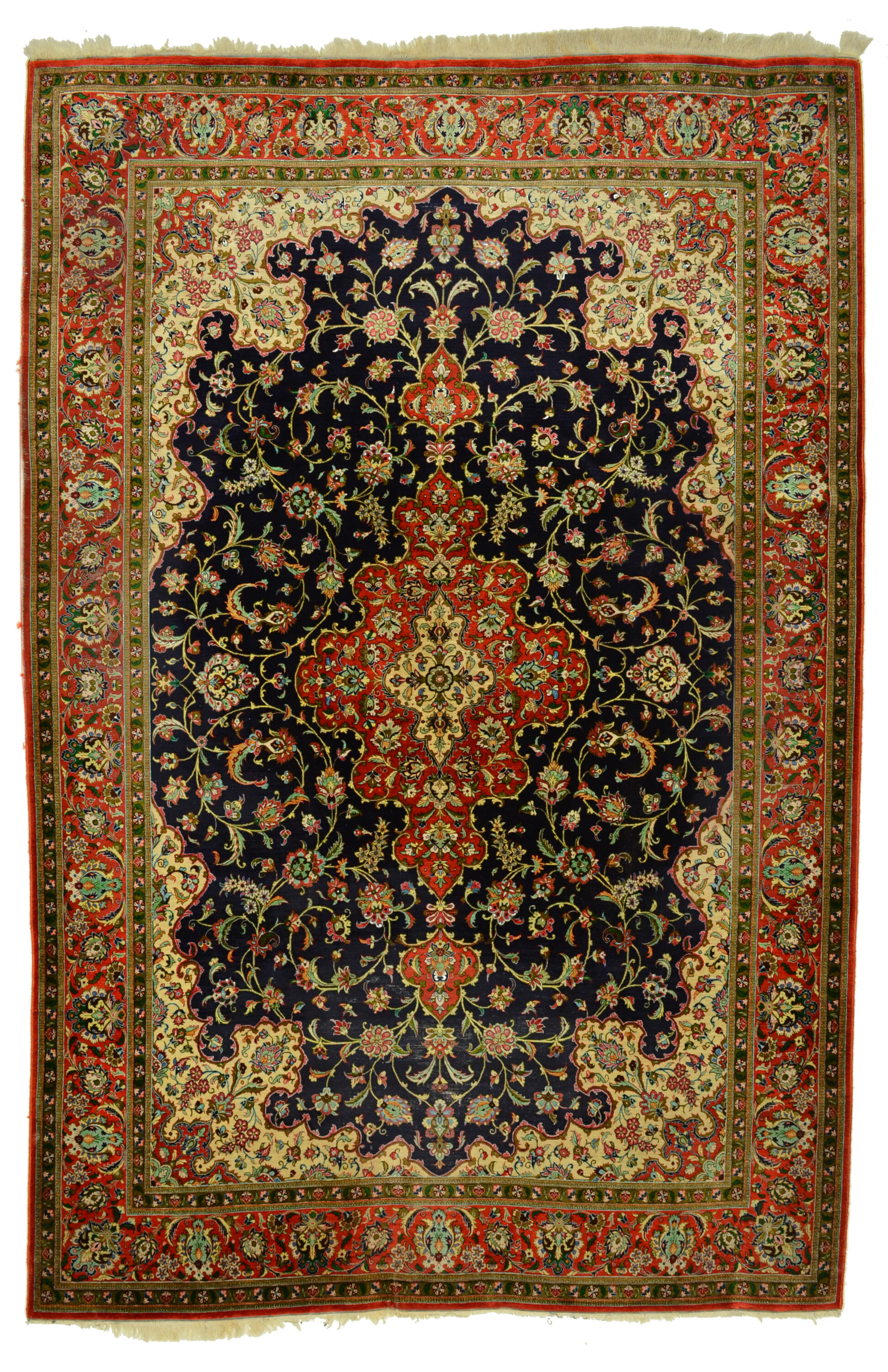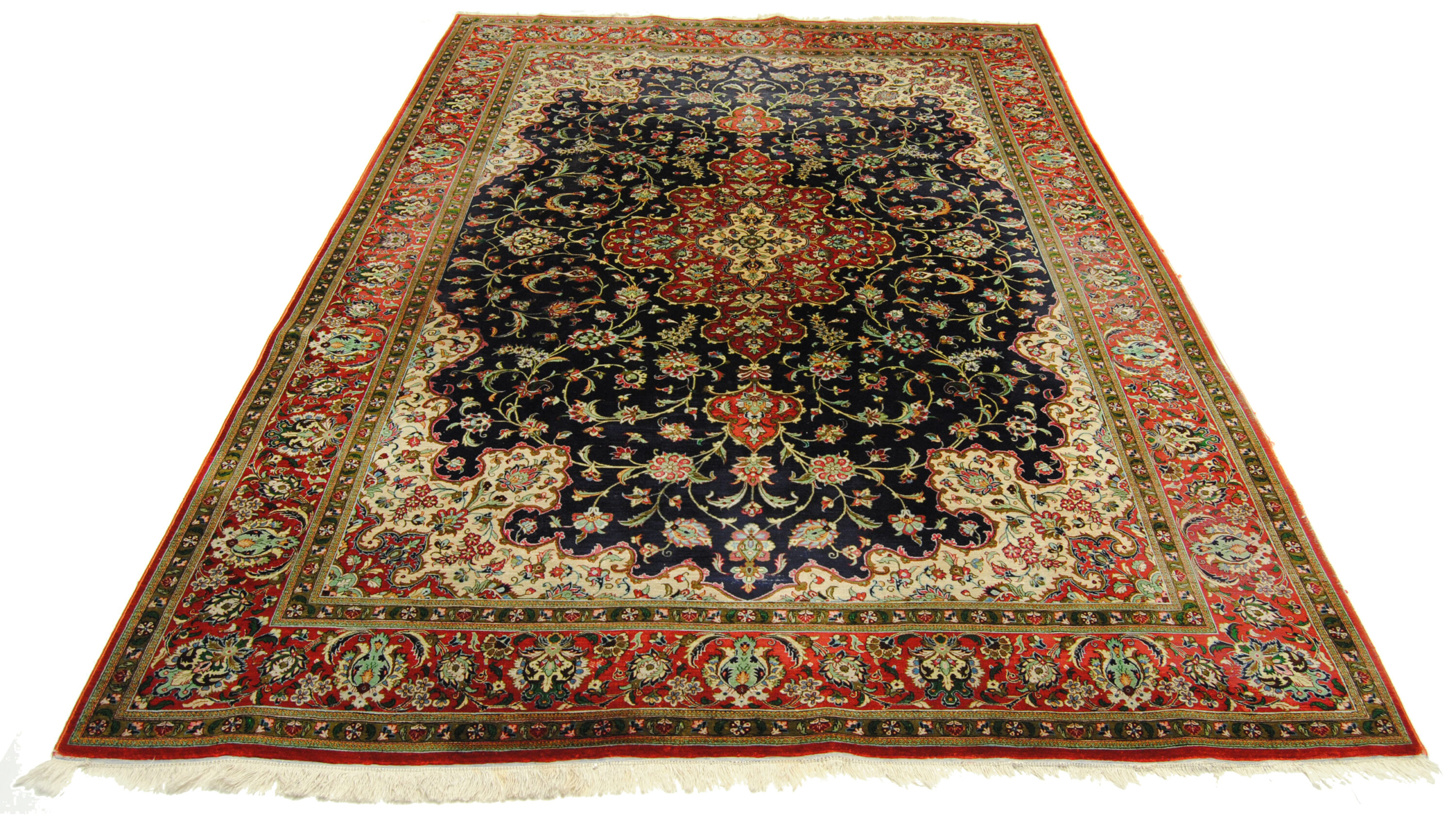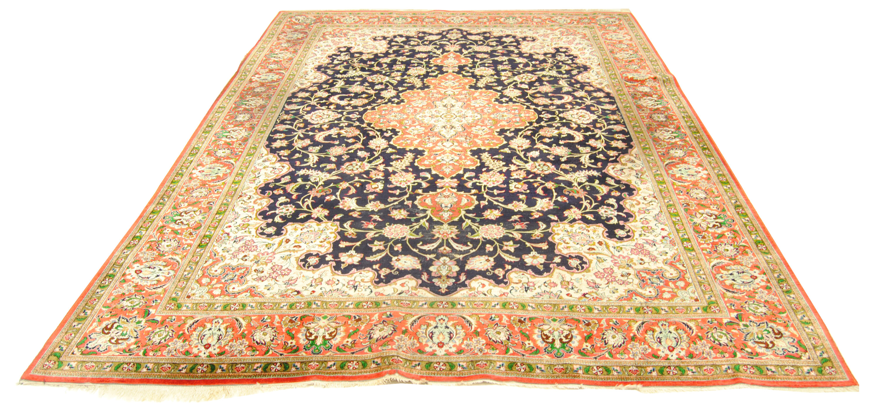 Ghom ist eine traditionsreiche, zentralperische Stadt in der Nähe von Teheran – bekannt auch als die heilige Stadt. Großen Ruhm haben speziell die Stücke aus Seide erlangt. Sie zählen zu den erlesensten und feinsten Knüpferzeugnissen der Welt und werden von langjährig geschulten MeisterknüpferInnen gefertigt. Die Motivwelten entspringen dabei vor allem der hochklassigen Architektur Persiens – so verleihen Ghoms jedem Raum eine besonders edle Note. Es handelt sich um einen Eintausch-Teppich (abgetreten) !