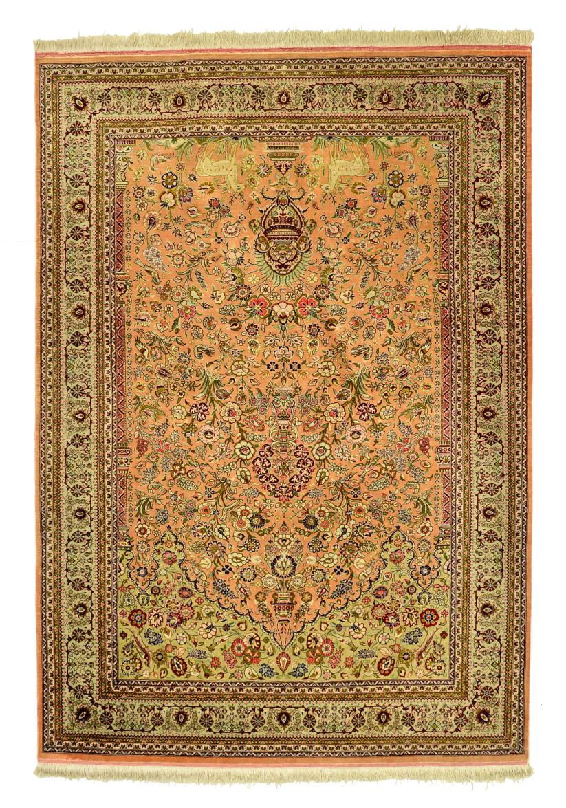 Ghom ist eine traditionsreiche, zentralperische Stadt in der Nähe von Teheran – bekannt auch als die heilige Stadt. Großen Ruhm haben speziell die Stücke aus Seide erlangt. Sie zählen zu den erlesensten und feinsten Knüpferzeugnissen der Welt und werden von langjährig geschulten MeisterknüpferInnen gefertigt. Die Motivwelten entspringen dabei vor allem der hochklassigen Architektur Persiens – so verleihen Ghoms jedem Raum eine besonders edle Note.