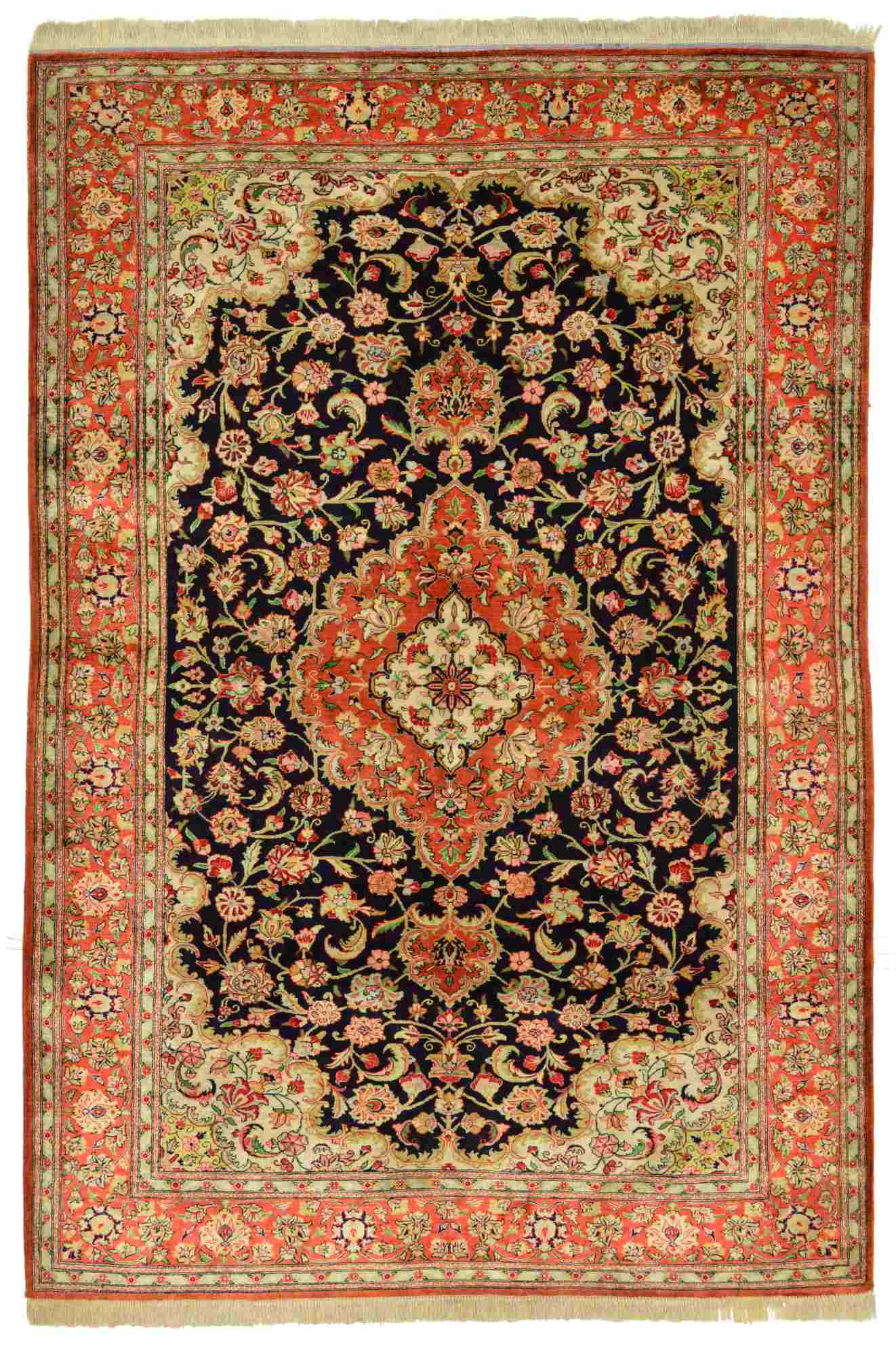 Ghom ist eine traditionsreiche, zentralperische Stadt in der Nähe von Teheran – bekannt auch als die heilige Stadt. Großen Ruhm haben speziell die Stücke aus Seide erlangt. Sie zählen zu den erlesensten und feinsten Knüpferzeugnissen der Welt und werden von langjährig geschulten MeisterknüpferInnen gefertigt. Die Motivwelten entspringen dabei vor allem der hochklassigen Architektur Persiens – so verleihen Ghoms jedem Raum eine besonders edle Note. Eintauschteppich, leichte Gebrauchsspuren.