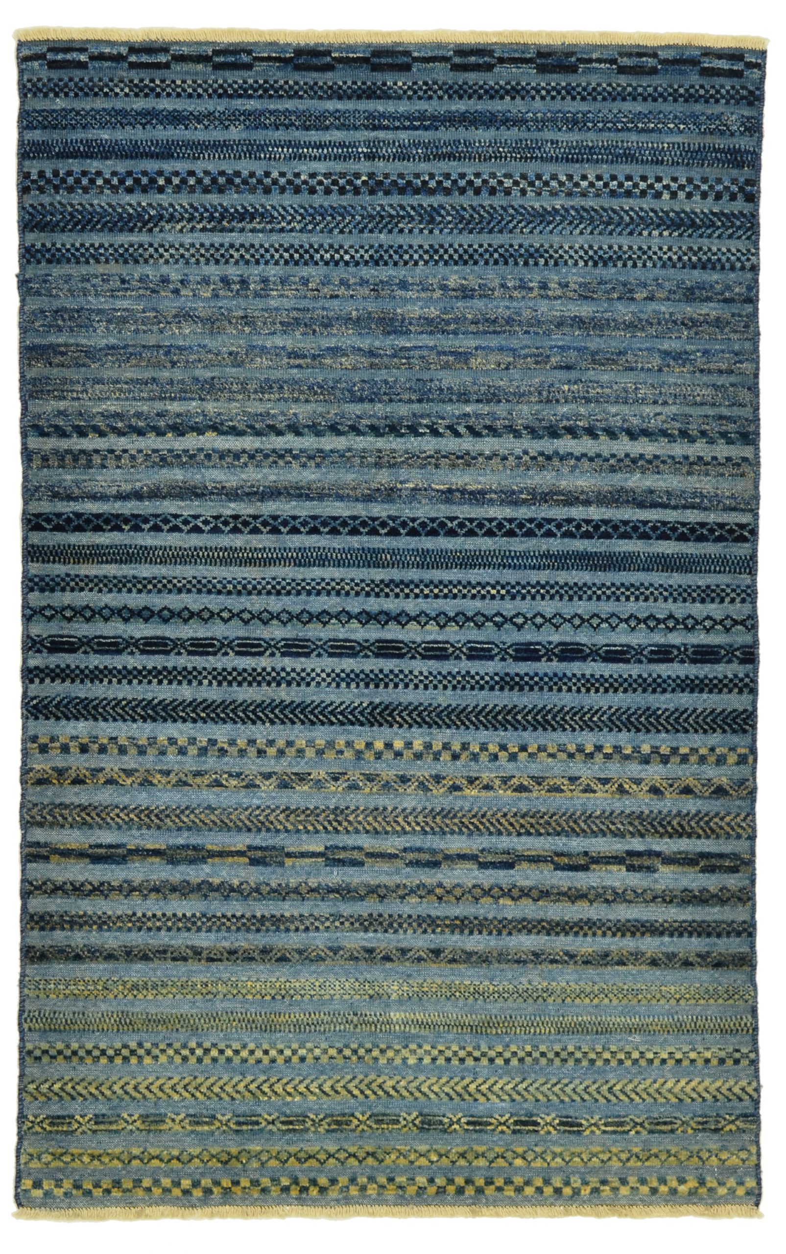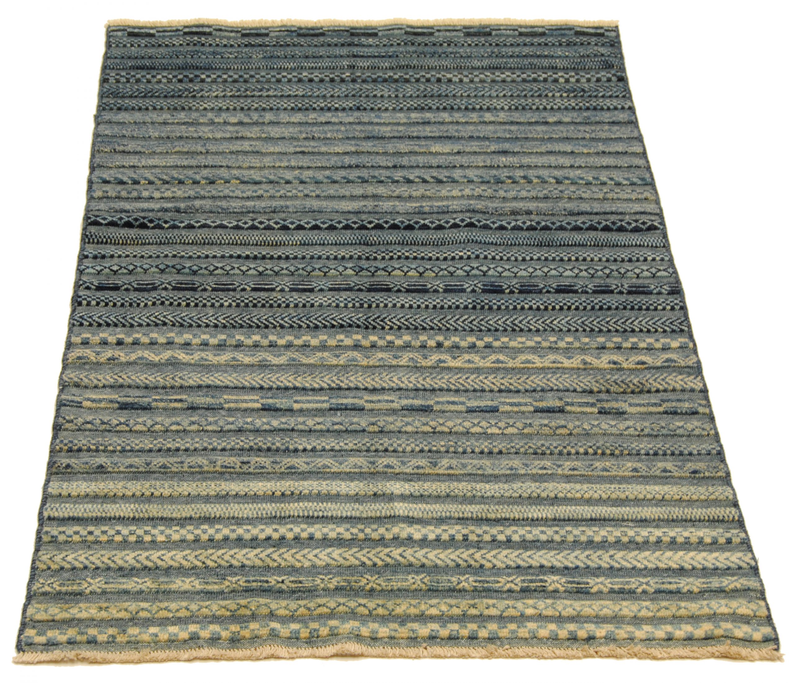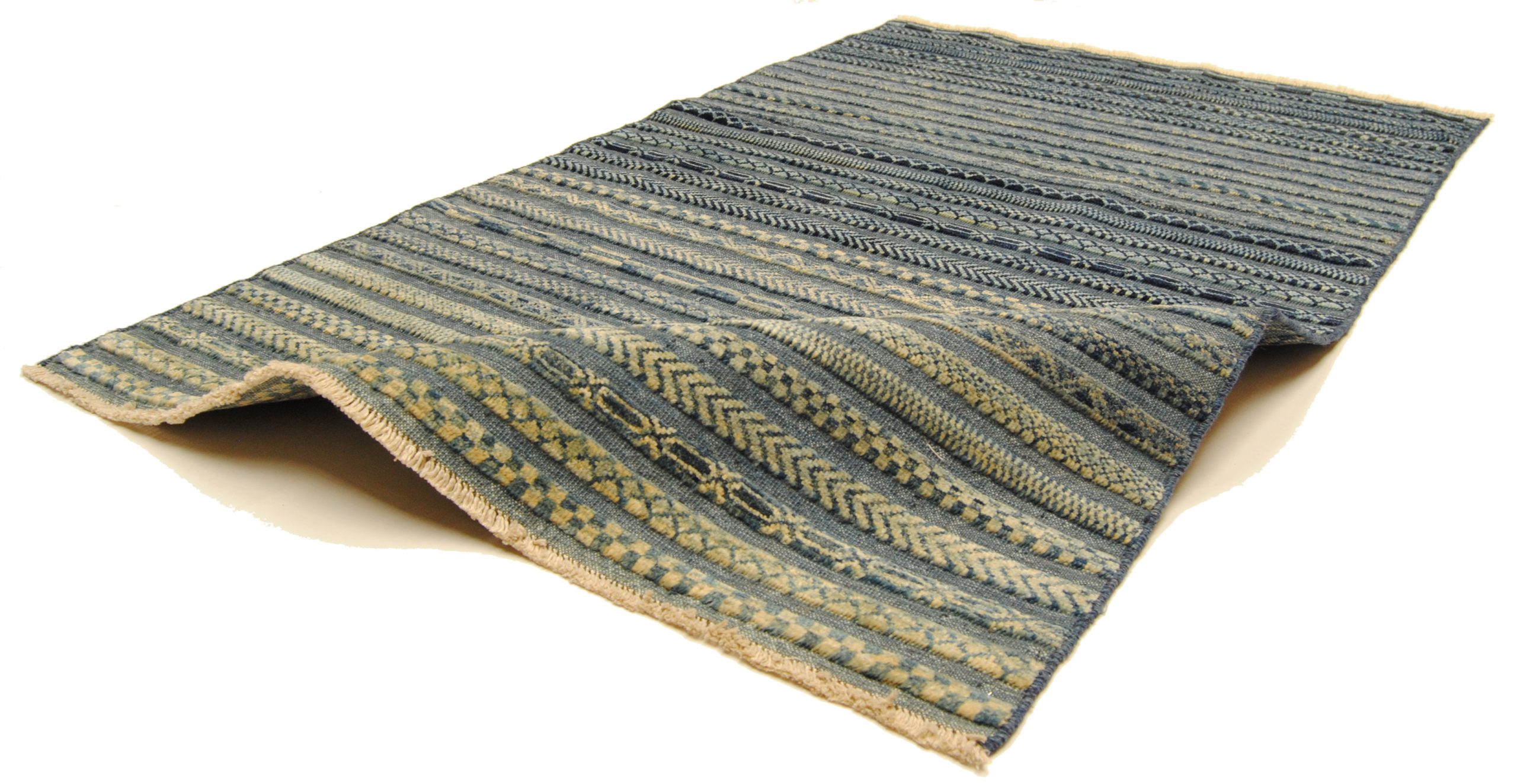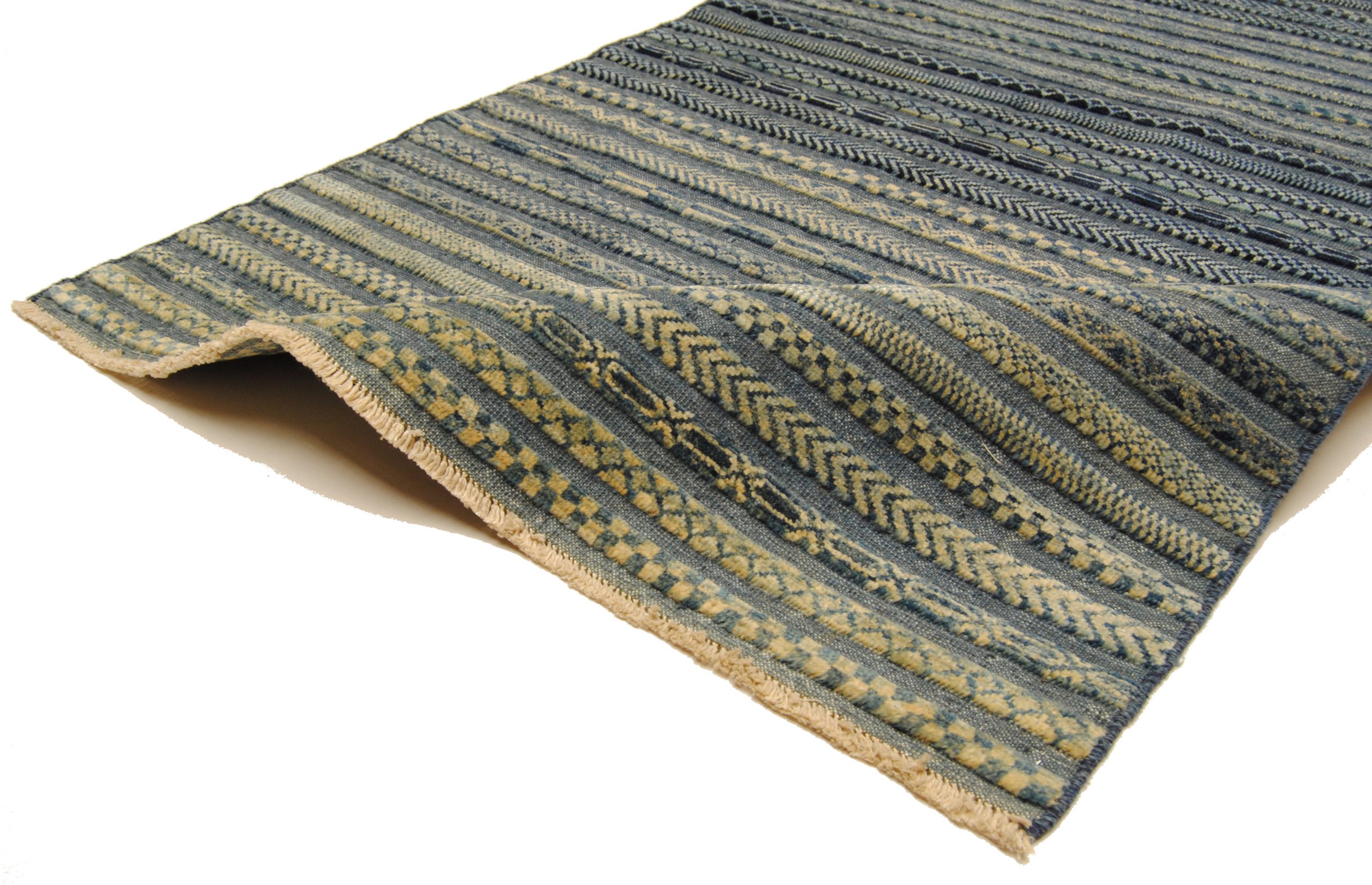 Die Hazara-Nimbaft-Honar-Kollektion besticht vorrangig durch ihr modernes, farbenfrohes Streifen-Design als auch durch die interessante Low-High Knüpftechnik: Nimbaft bedeutet auf persische halb geknüpft und halb gewebt.