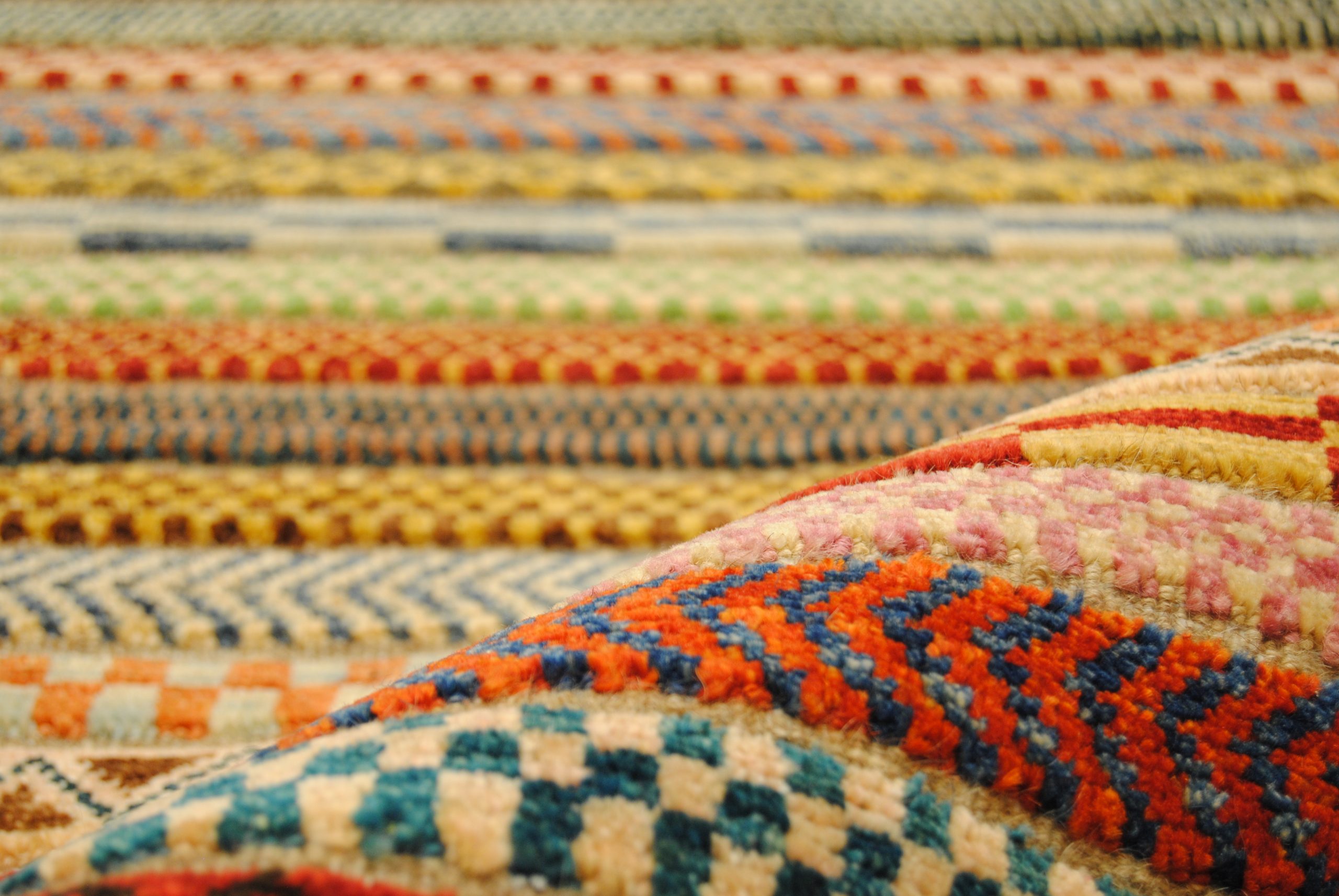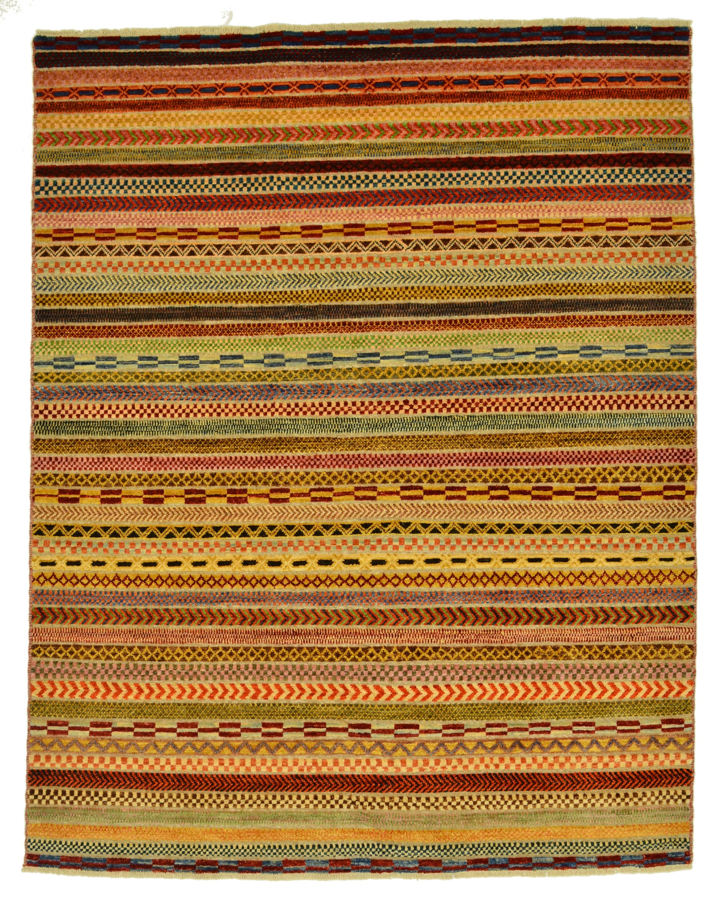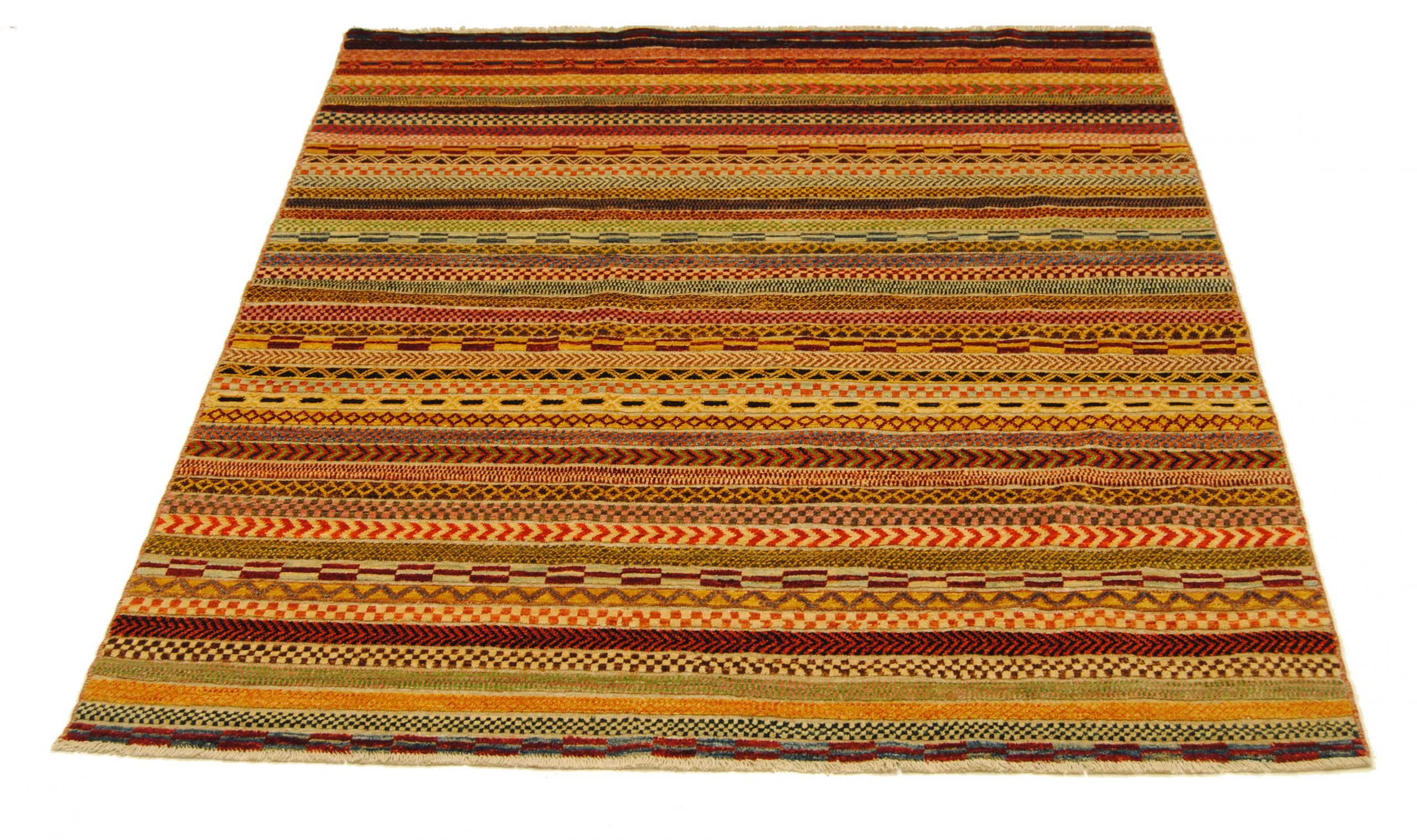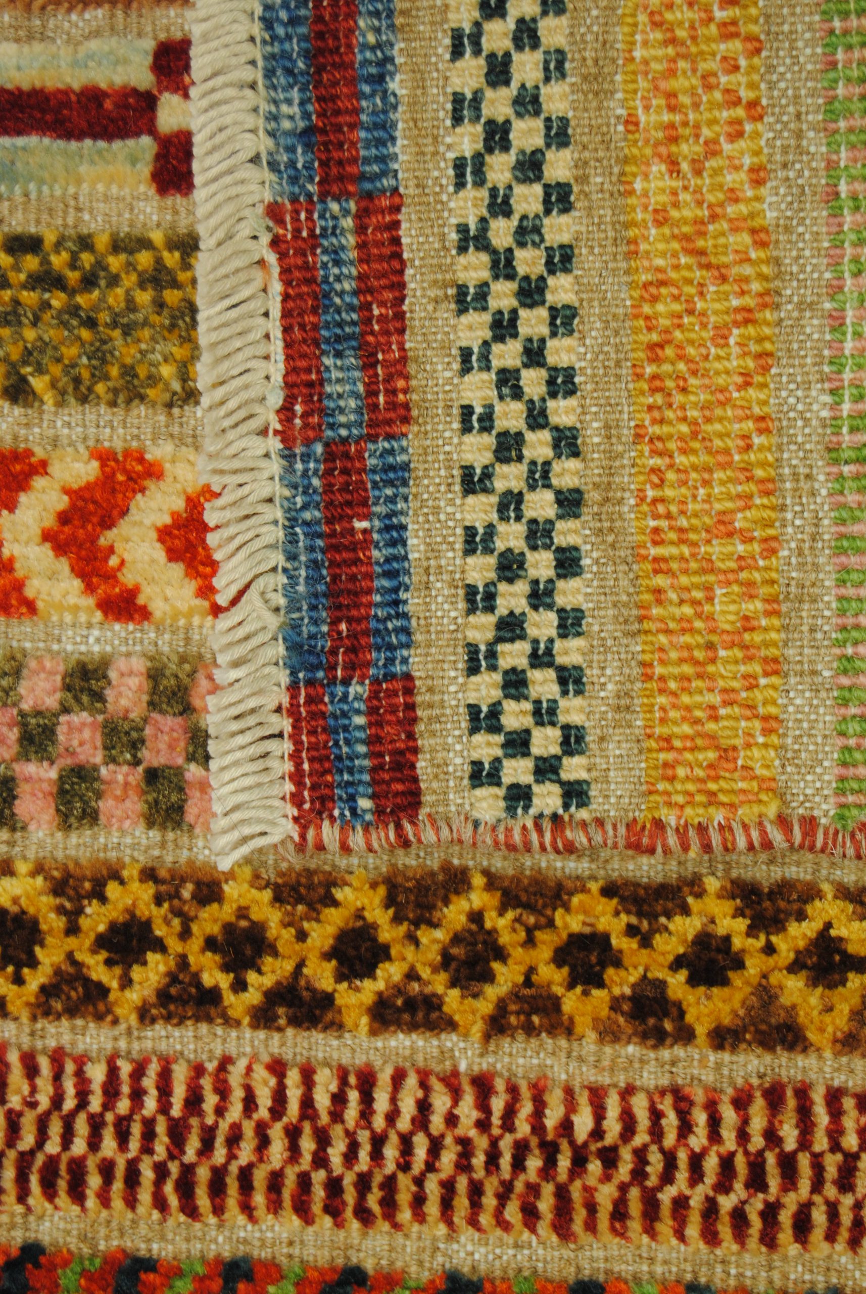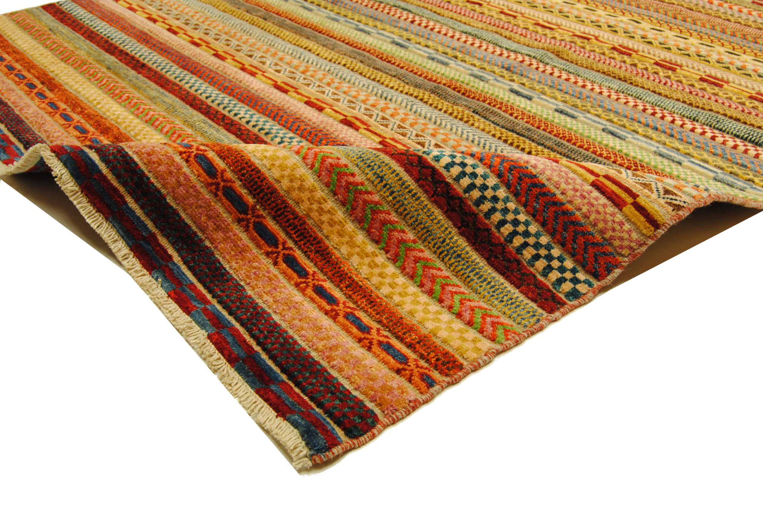 Die Hazara-Nimbaft-Honar-Kollektion besticht vorrangig durch ihr modernes, farbenfrohes Streifen-Design als auch durch die interessante Low-High Knüpftechnik: Nimbaft bedeutet auf persische halb geknüpft und halb gewebt.