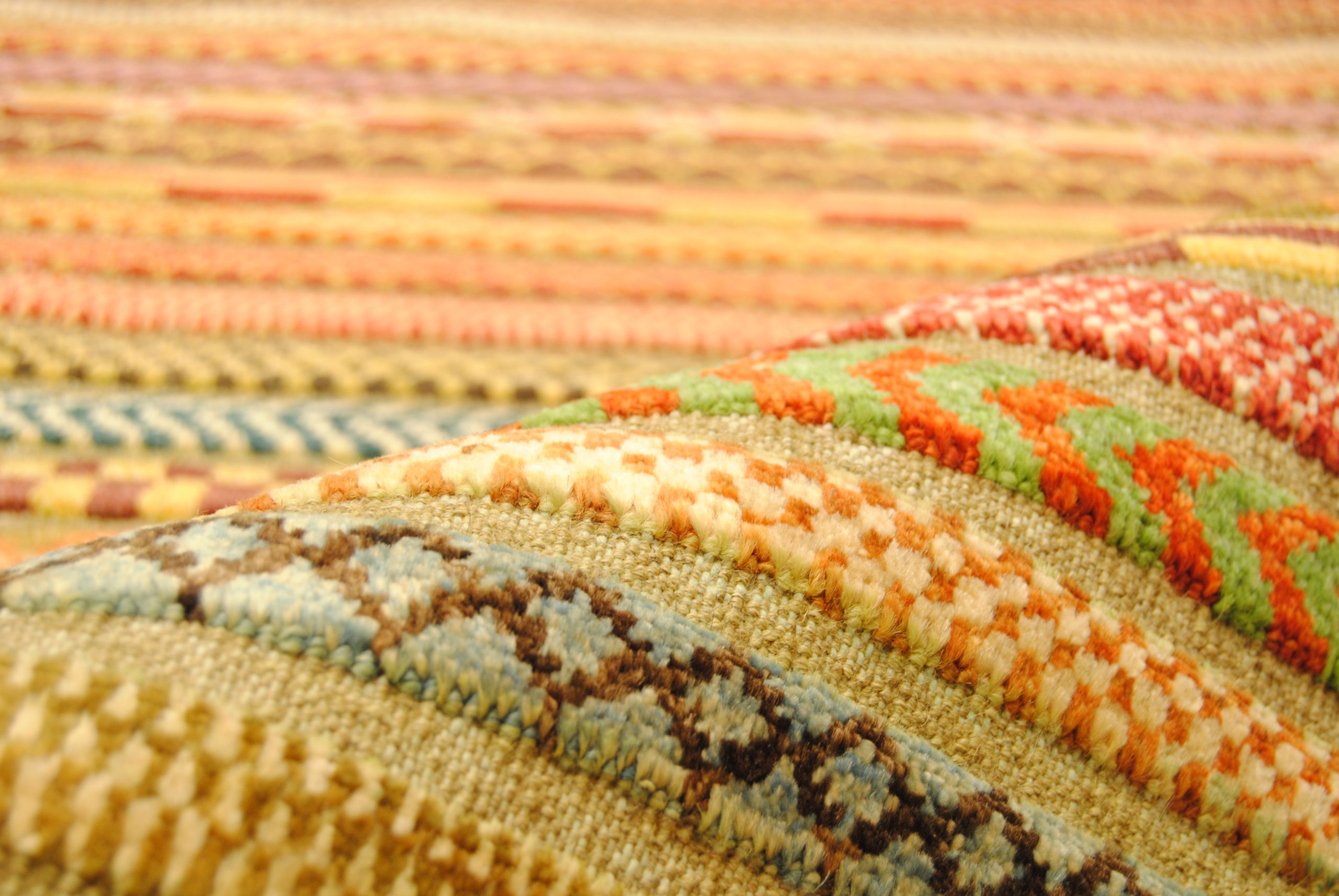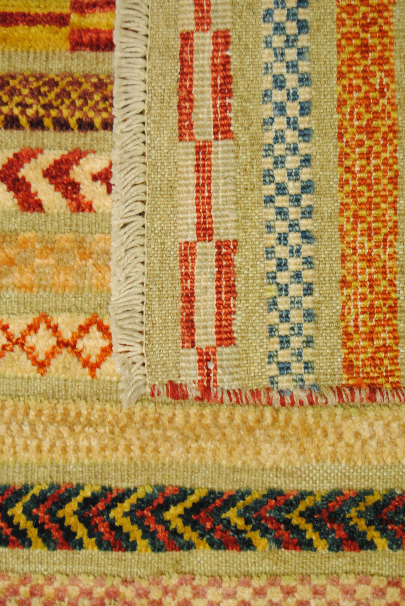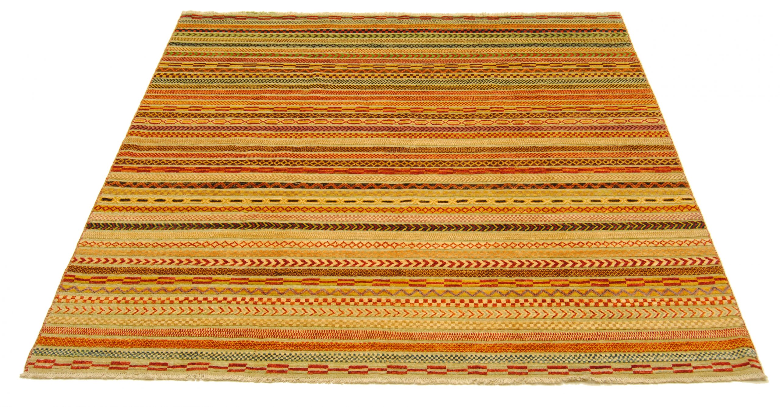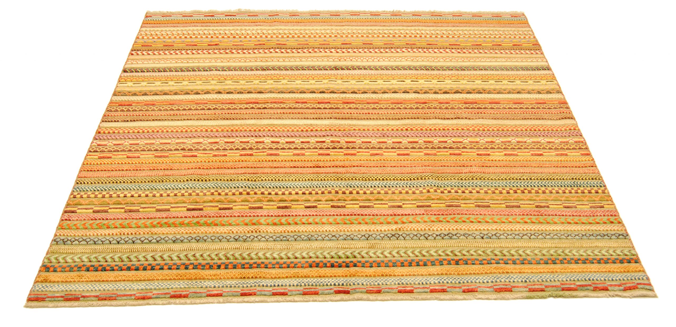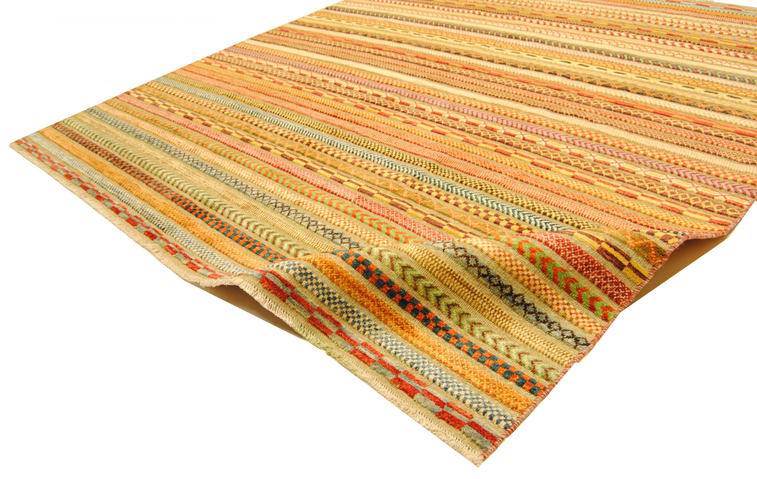 Die Hazara-Nimbaft-Honar-Kollektion besticht vorrangig durch ihr modernes, farbenfrohes Streifen-Design als auch durch die interessante Low-High Knüpftechnik: Nimbaft bedeutet auf persische halb geknüpft und halb gewebt.