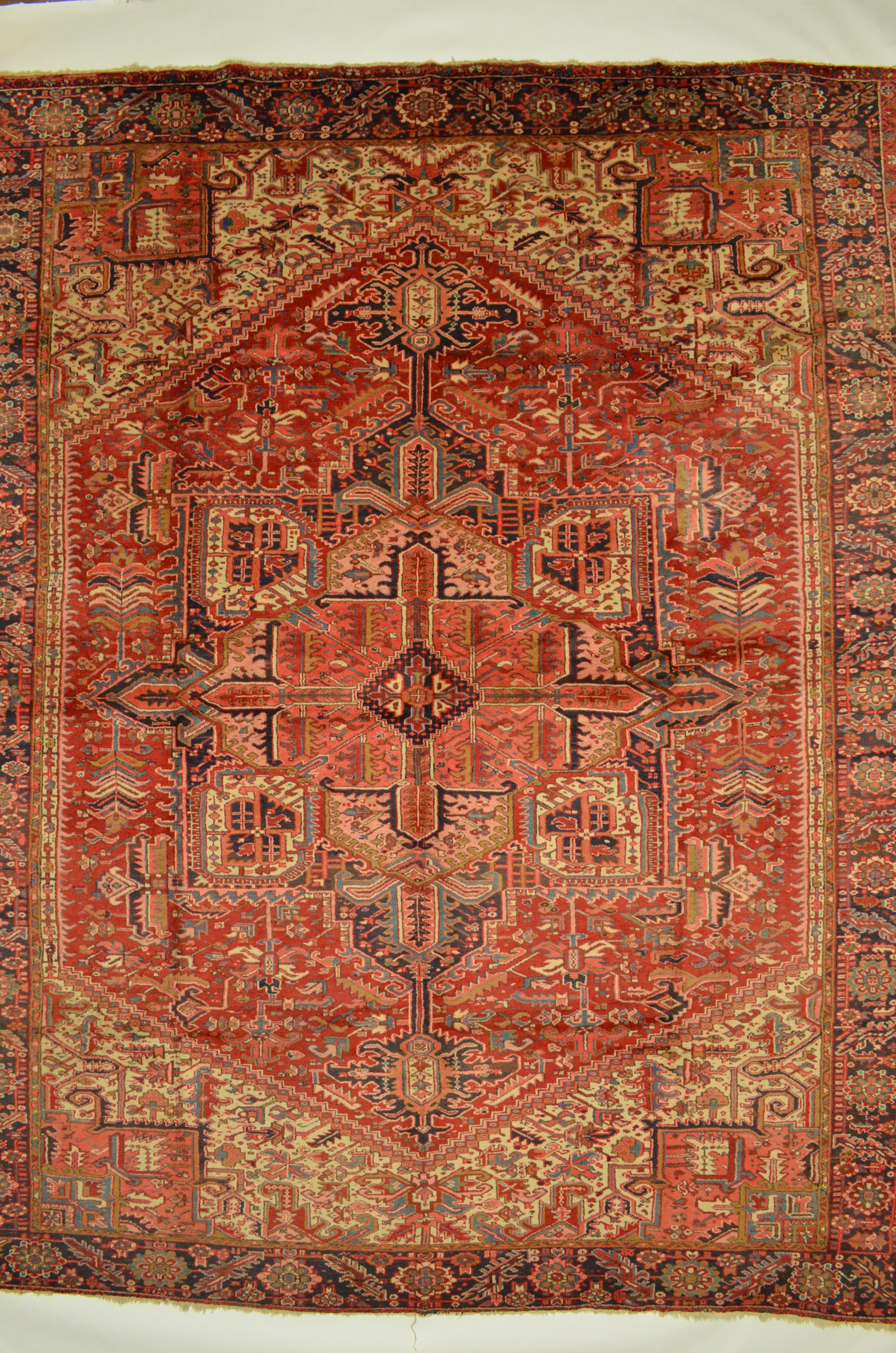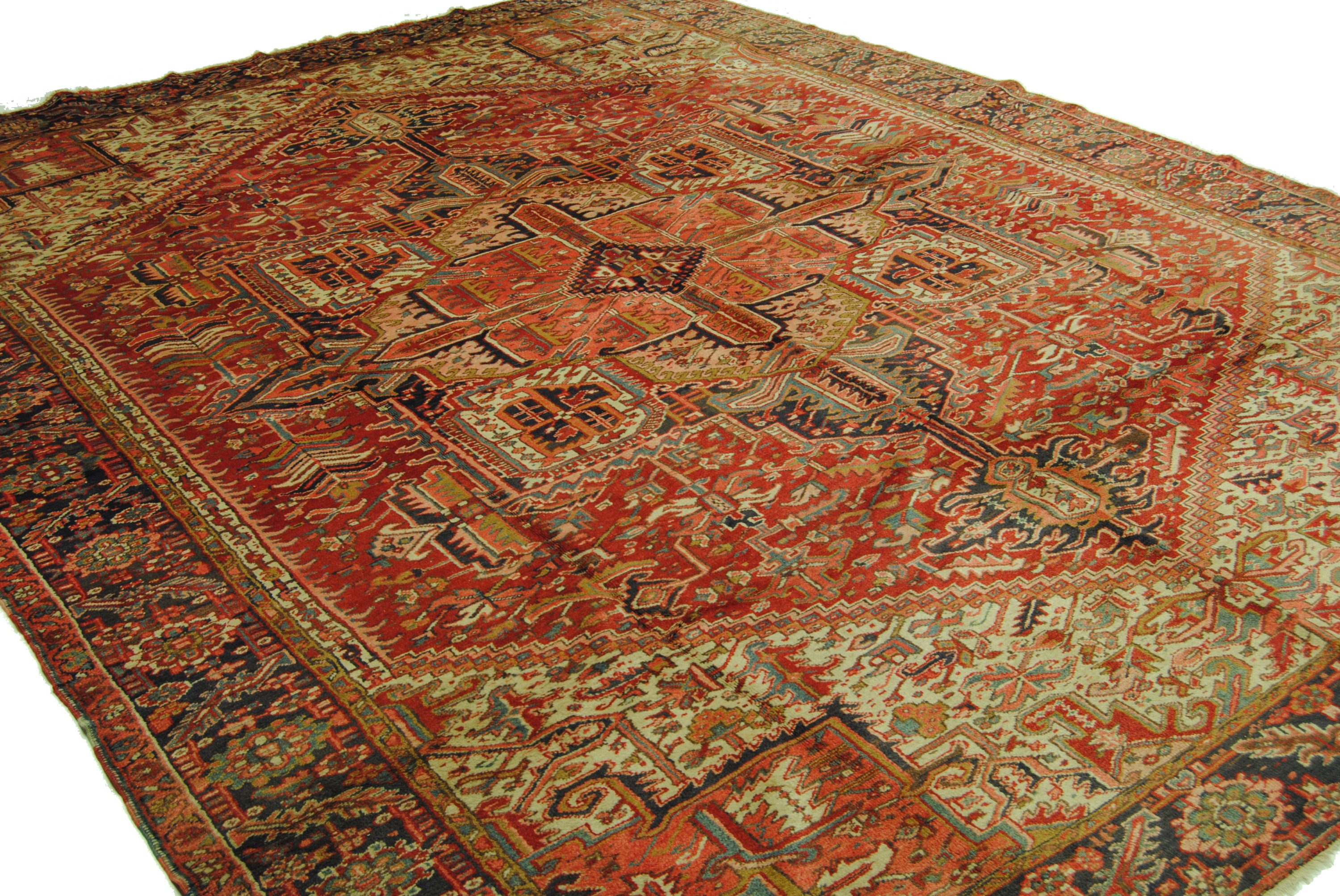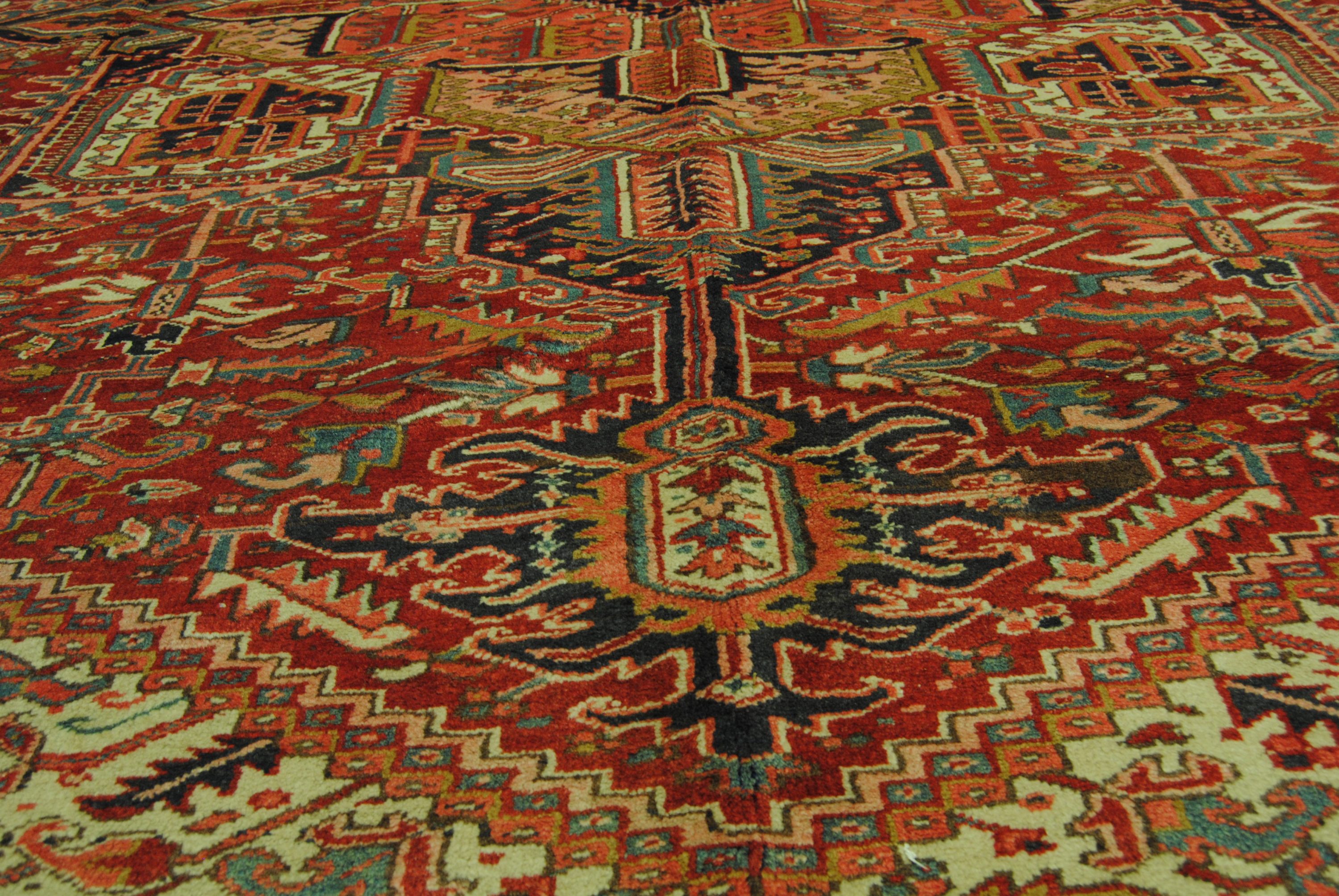 Heriz Teppiche gelten als äußerst strapazierfähig und sind bekannt für hohe Wollqualität, Verschleißfestigkeit und Dauerhaftigkeit, die sind ziemlich leicht zu erkennen – sie weisen häufig ein charakteristisches, großes, rechteckiges Medaillon und große, markierte Eckabschnitte auf.