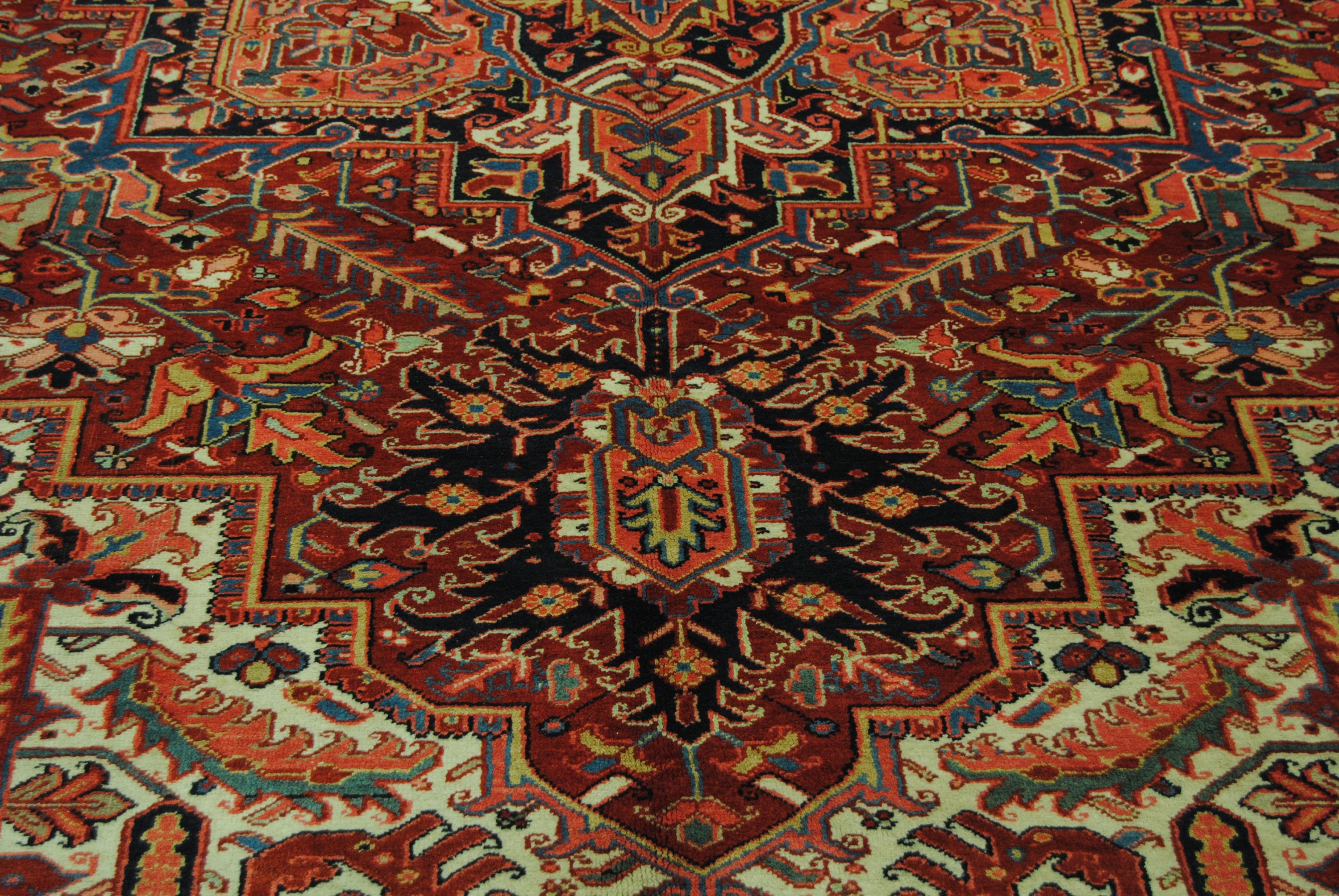 Die Stadt Heriz im nordwestlichen Iran ist bekannt für Teppiche mit warmen Farben und hervorragender Strapazierfähigkeit. Die Muster sind geprägt von der archaisch anmutenden Geometrie der nördlich gelegenen Kaukasus-Teppiche.