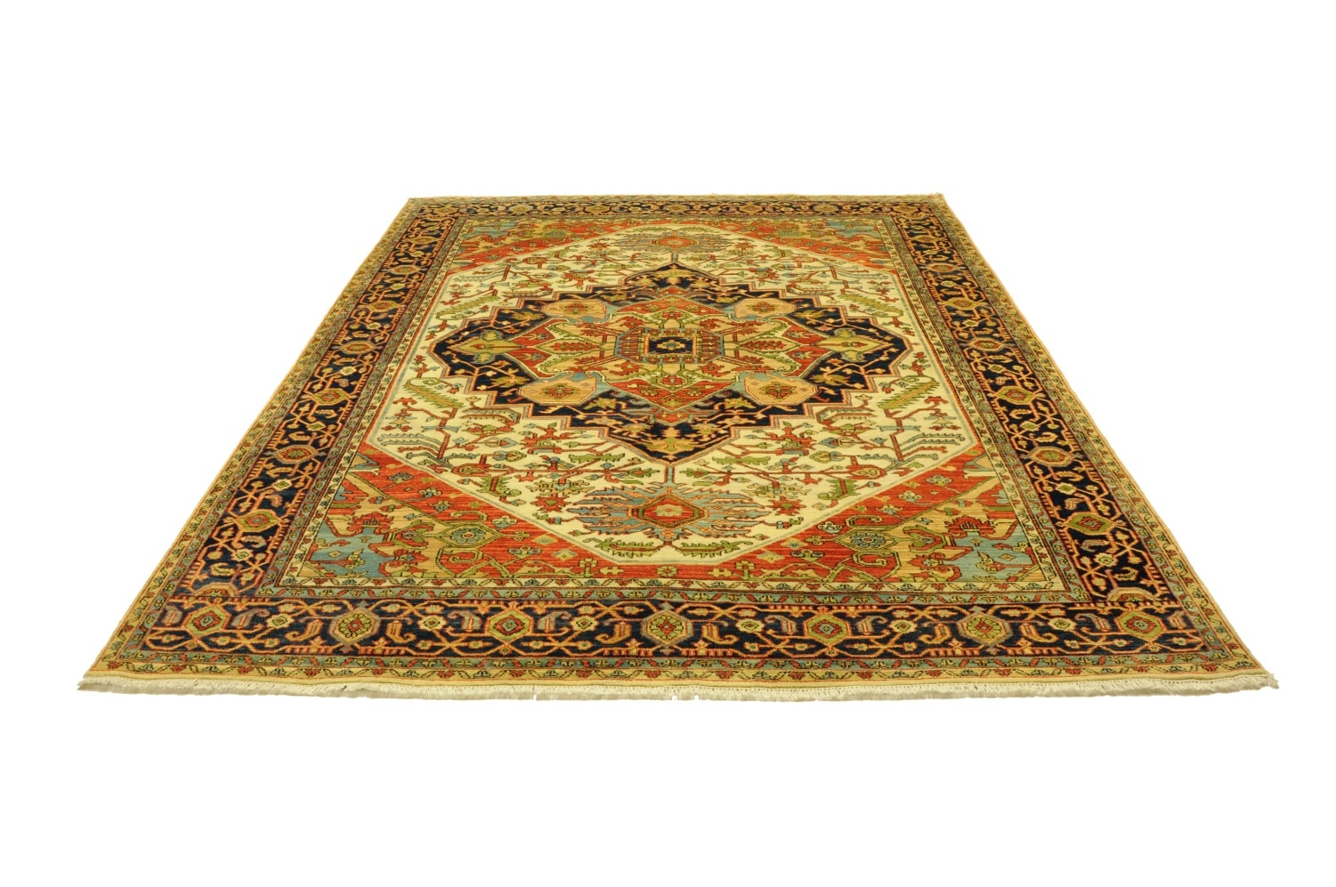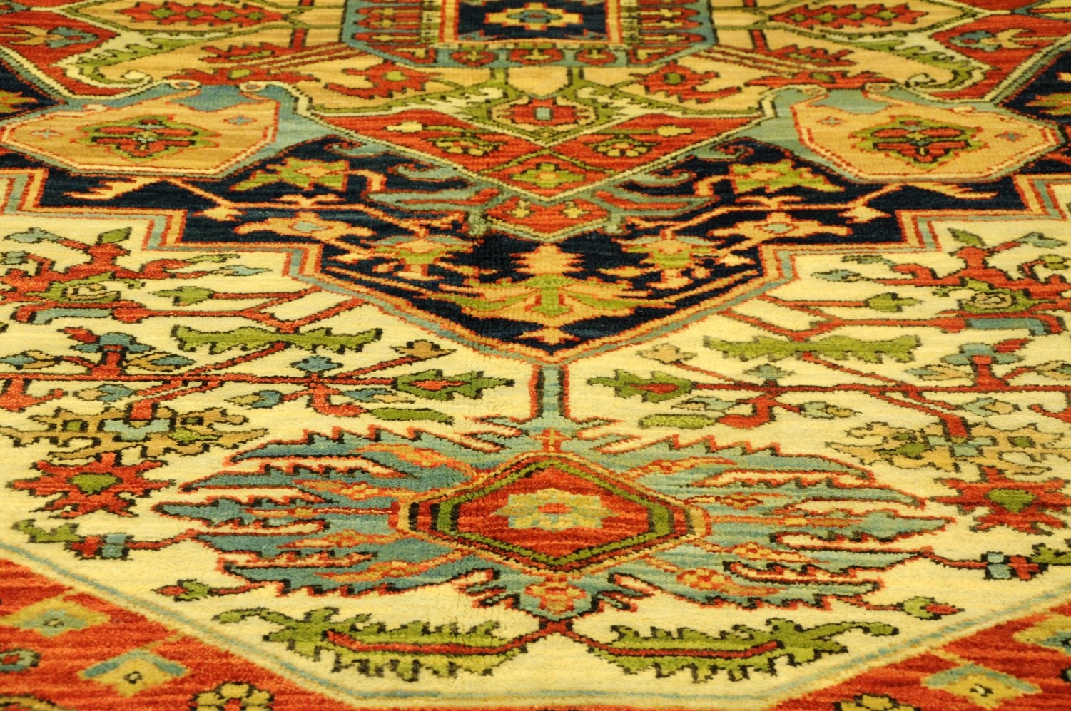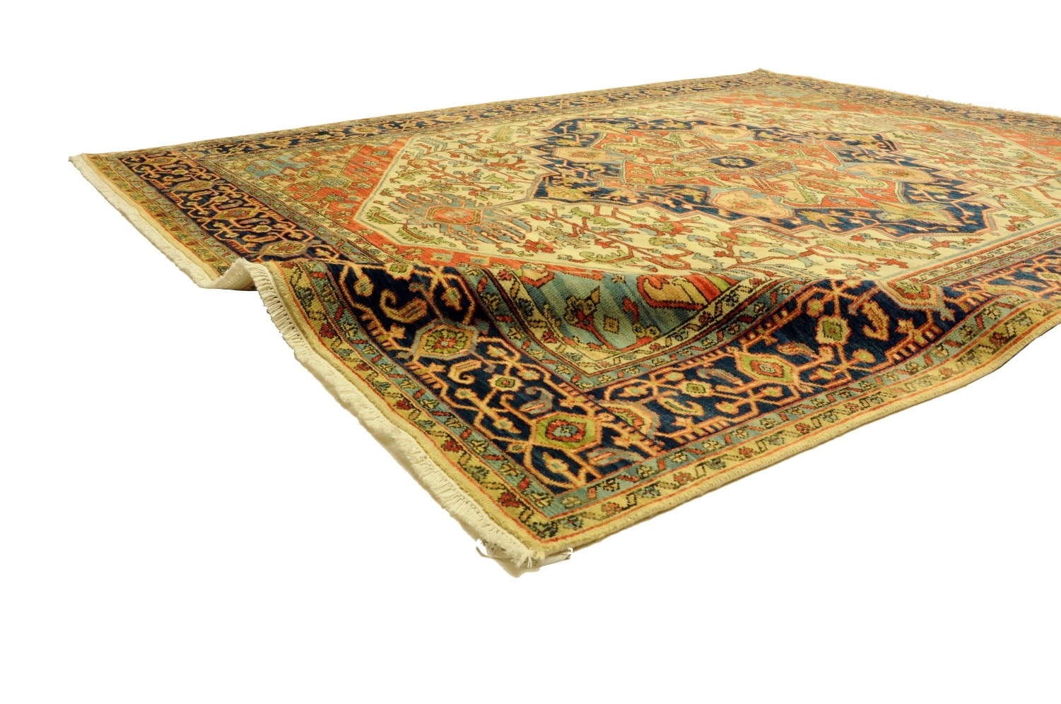 Die Heriz Serapi Revival Kollektion nimmt Bezug auf eine berühmte Epoche der persischen Knüpfkultur des 19. Jahrhunderts. Engagierte indische Teppiche-Werkstätten setzen diese archaisch anmutenden, historisch bedeutsamen Muster – benannt nach der norpersischen Stadt Sarab – mit sehr guter Wolle und edlen, patinierten Farben um.