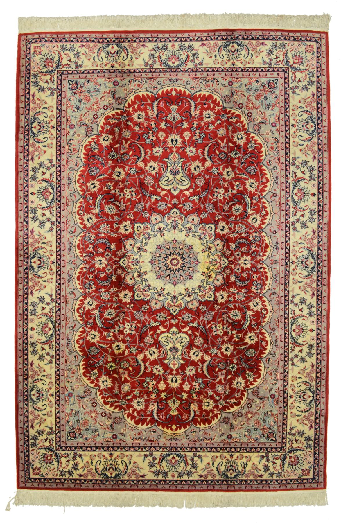 Schöner feiner Isfahan Teppich aus der mittlerweile seltenen Serie der hochwertigen chinesischen Epoche. Geknüpft mit bester, besonders fettreicher und somit strapazfähiger Hochlandwolle. Ausstellungsstück – leichter Fleckenschaden.