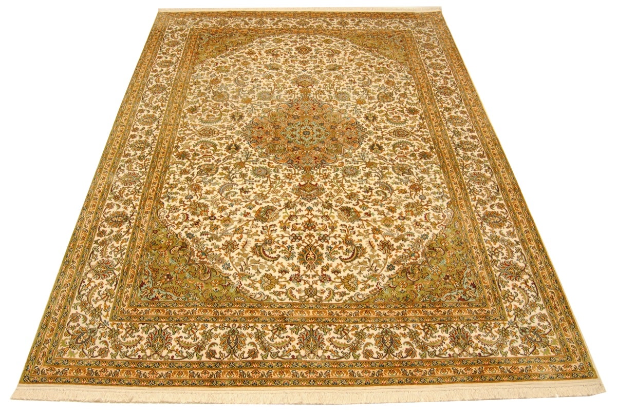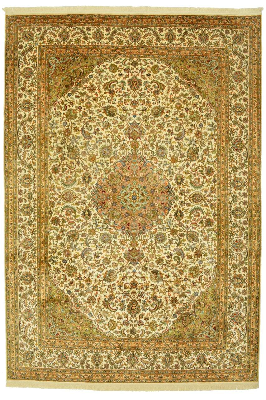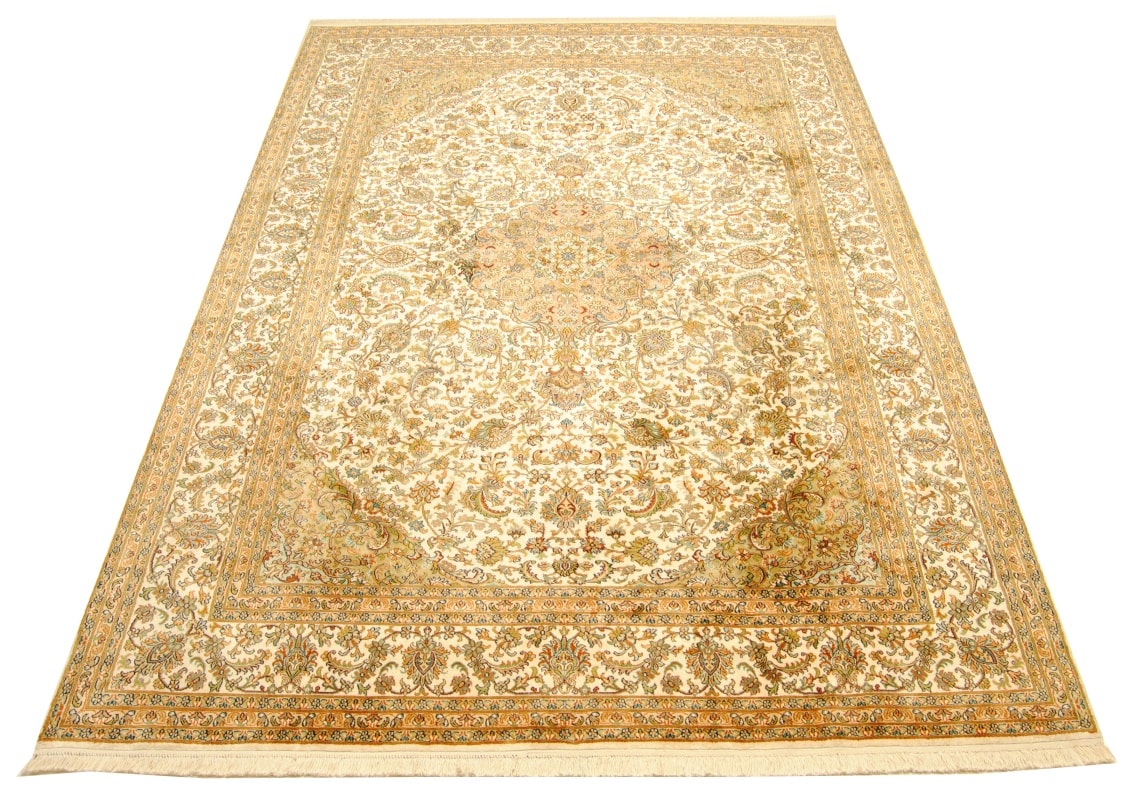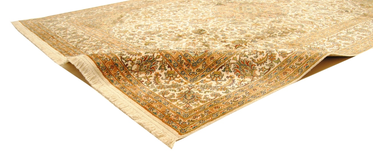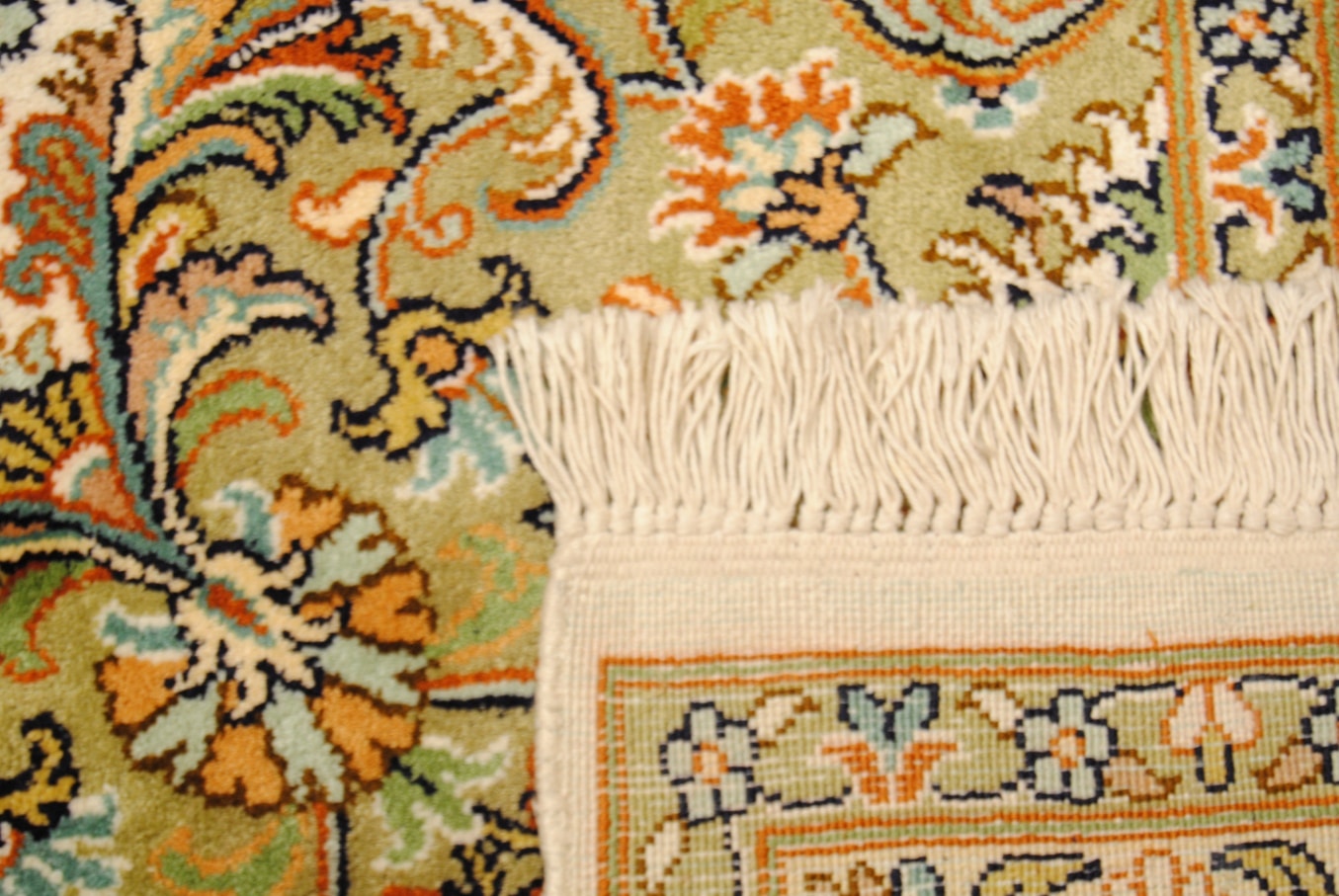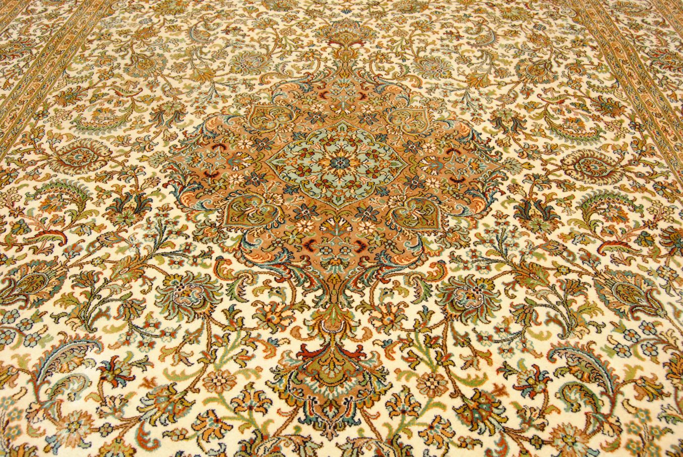 Kaschmir -Seidenteppiche weisen meist klassische persische Deisgns auf. Das beliebte Garten(felder)motiv ist dabei sehr häufig vertreten. Durch die Verwendung von Seide und die hohe Knüpfdichte ist ein beeindruckender Musterreichtum gegeben.