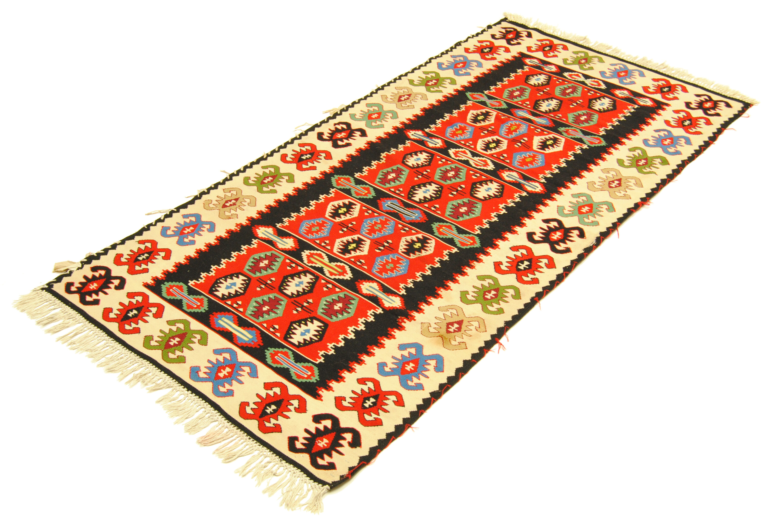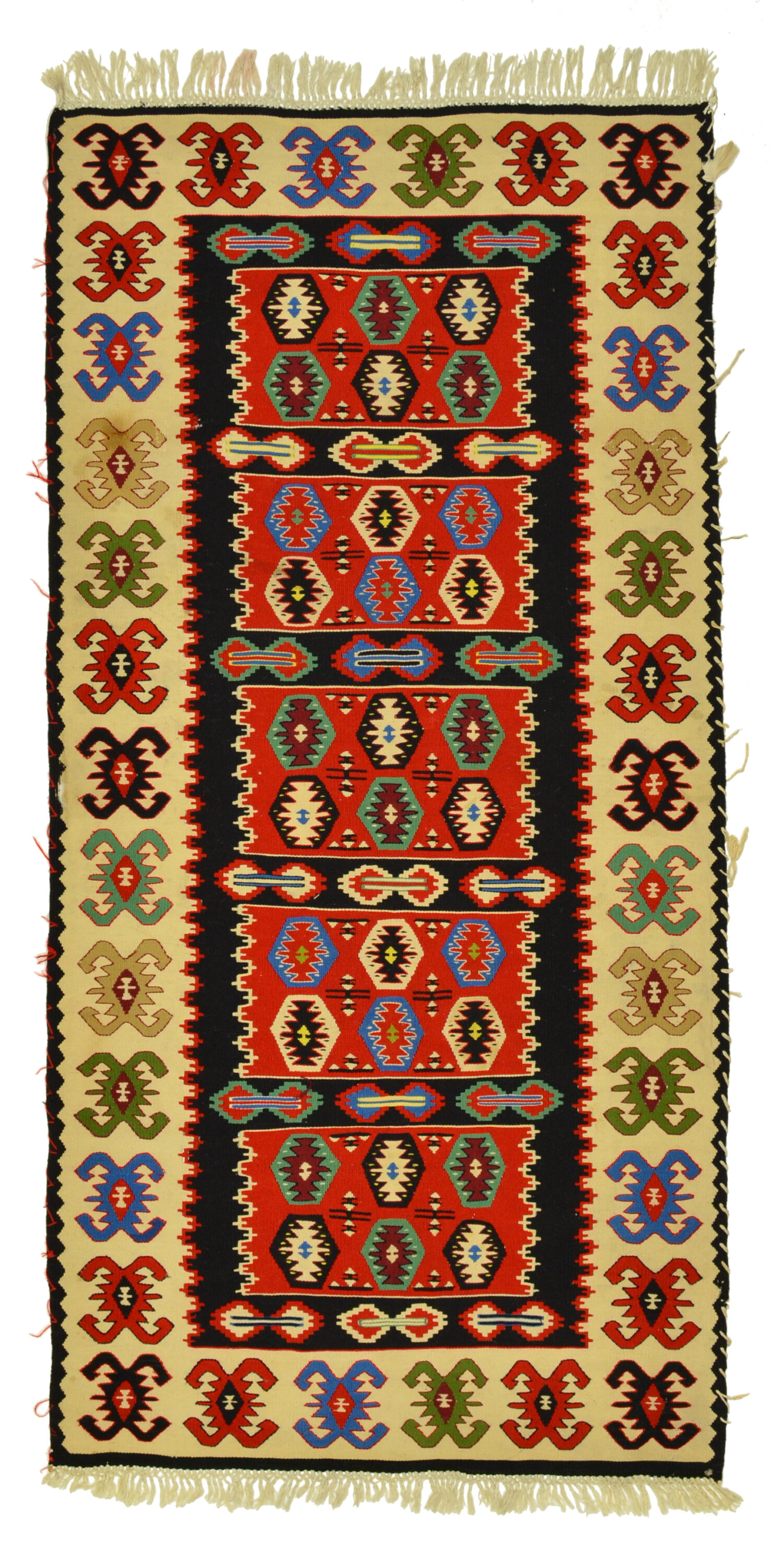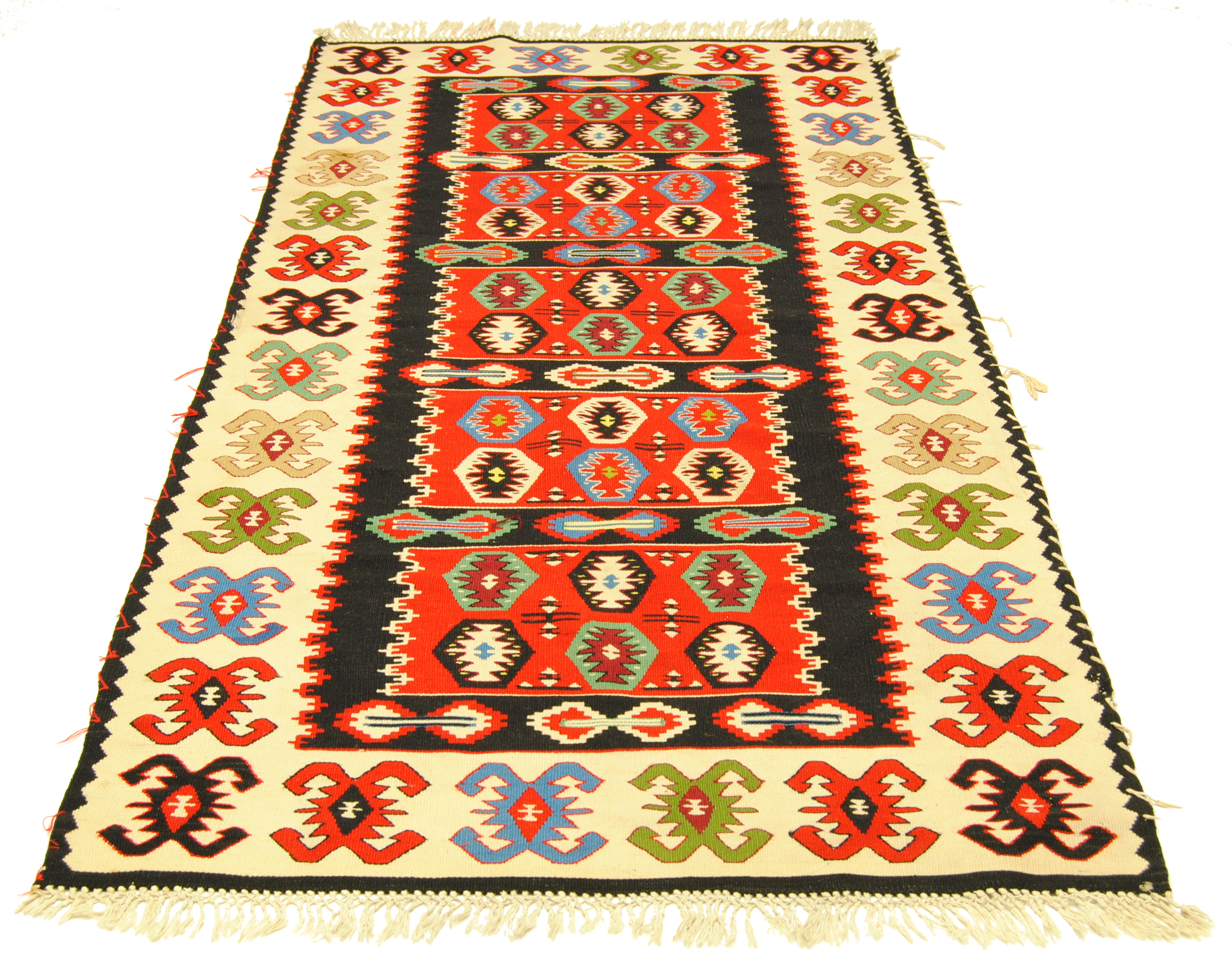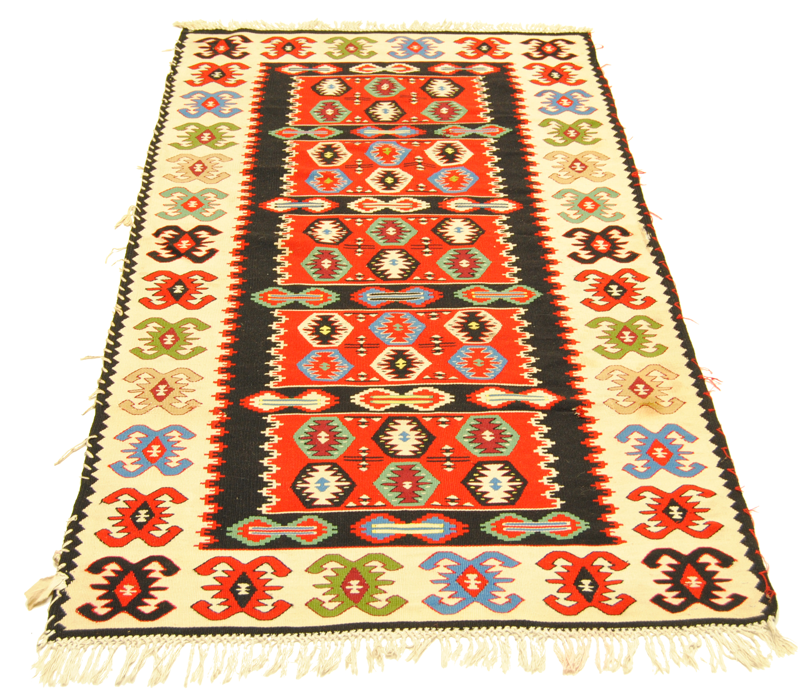 Edle Kelim-kunst aus Albanien mit geometrischer Musterung und gedeckten Farben. Eintausch-Teppich mit paar Flecken