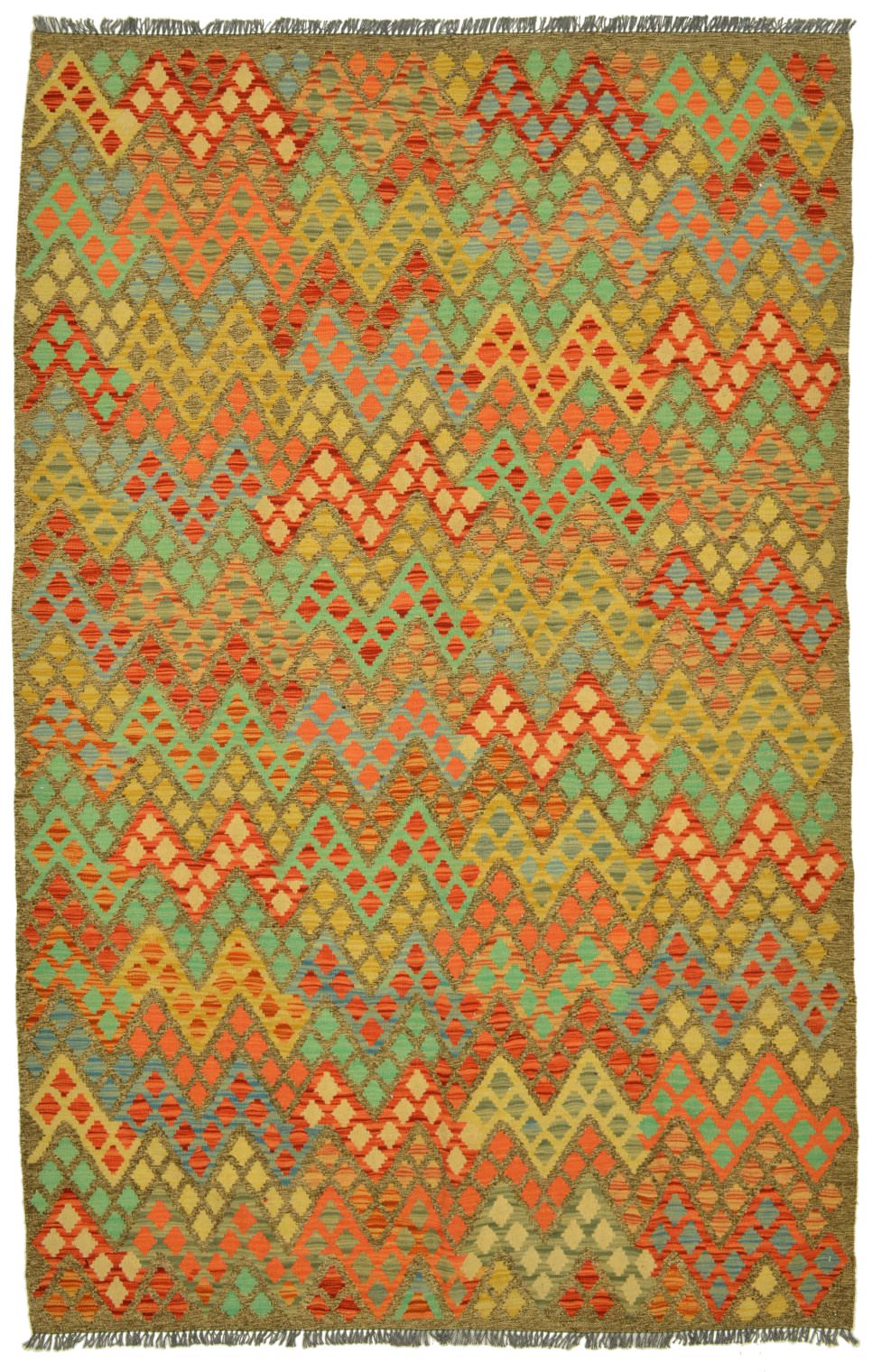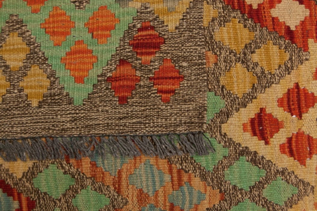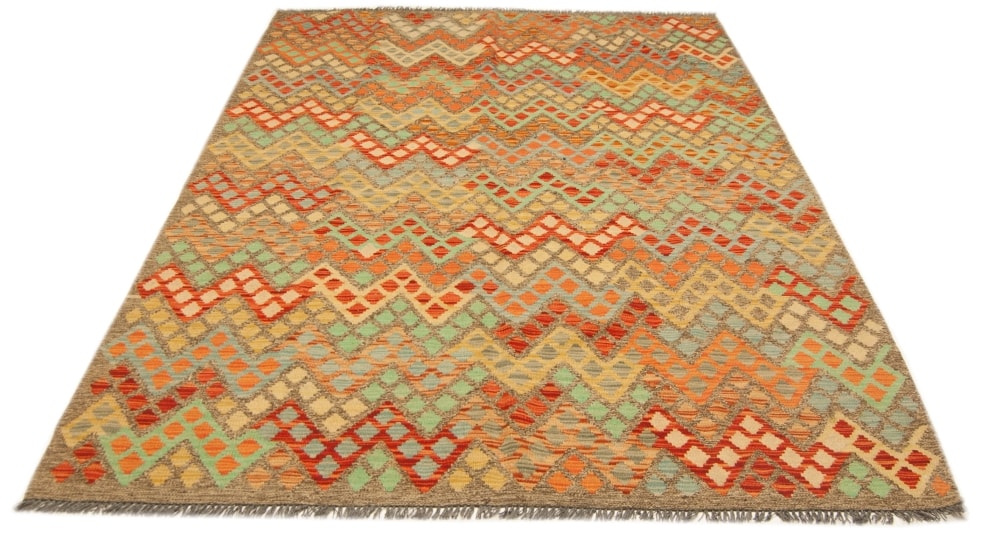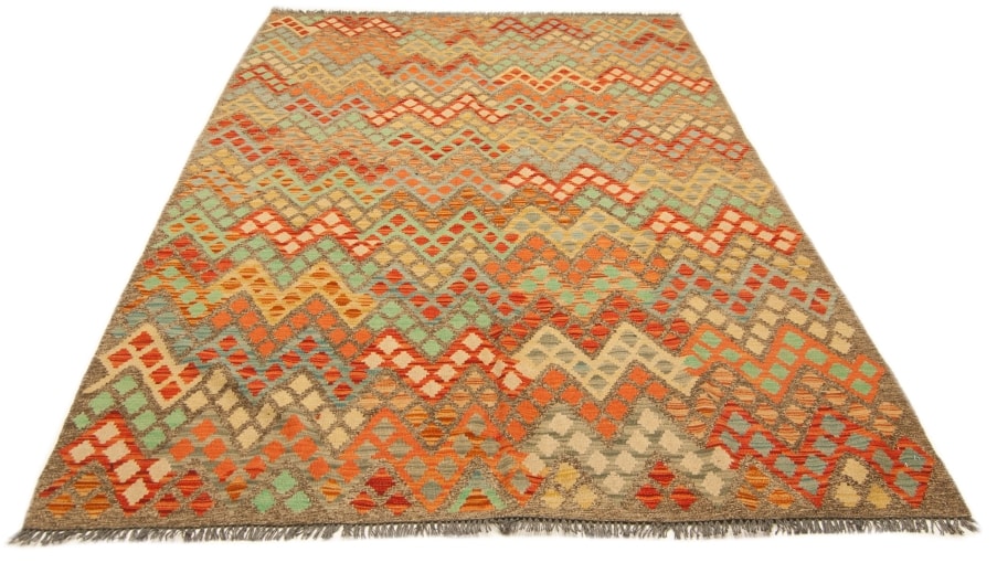Edle Kelim-kunst aus Afghanistan mit geometrischer Musterung und gedeckten Farben.
