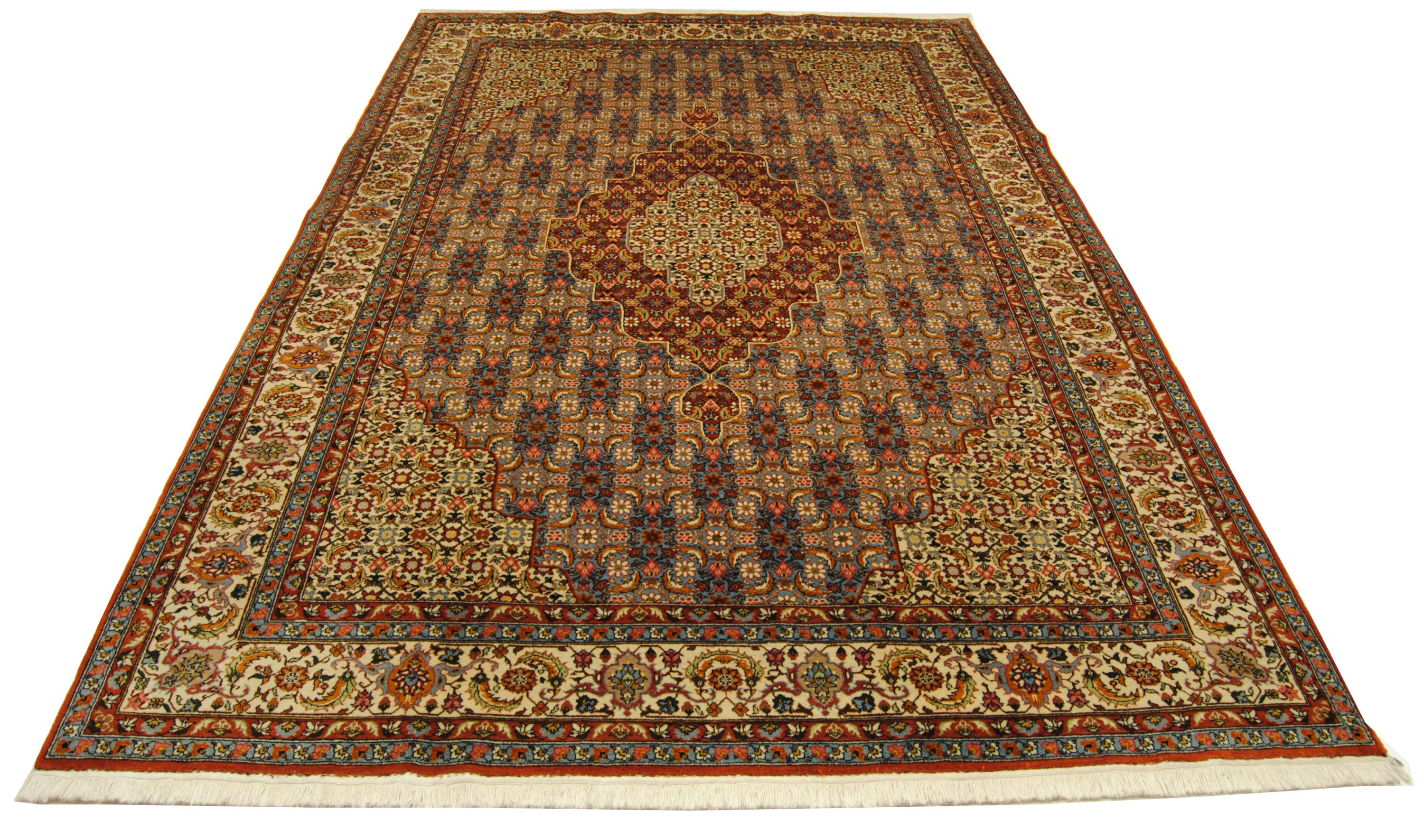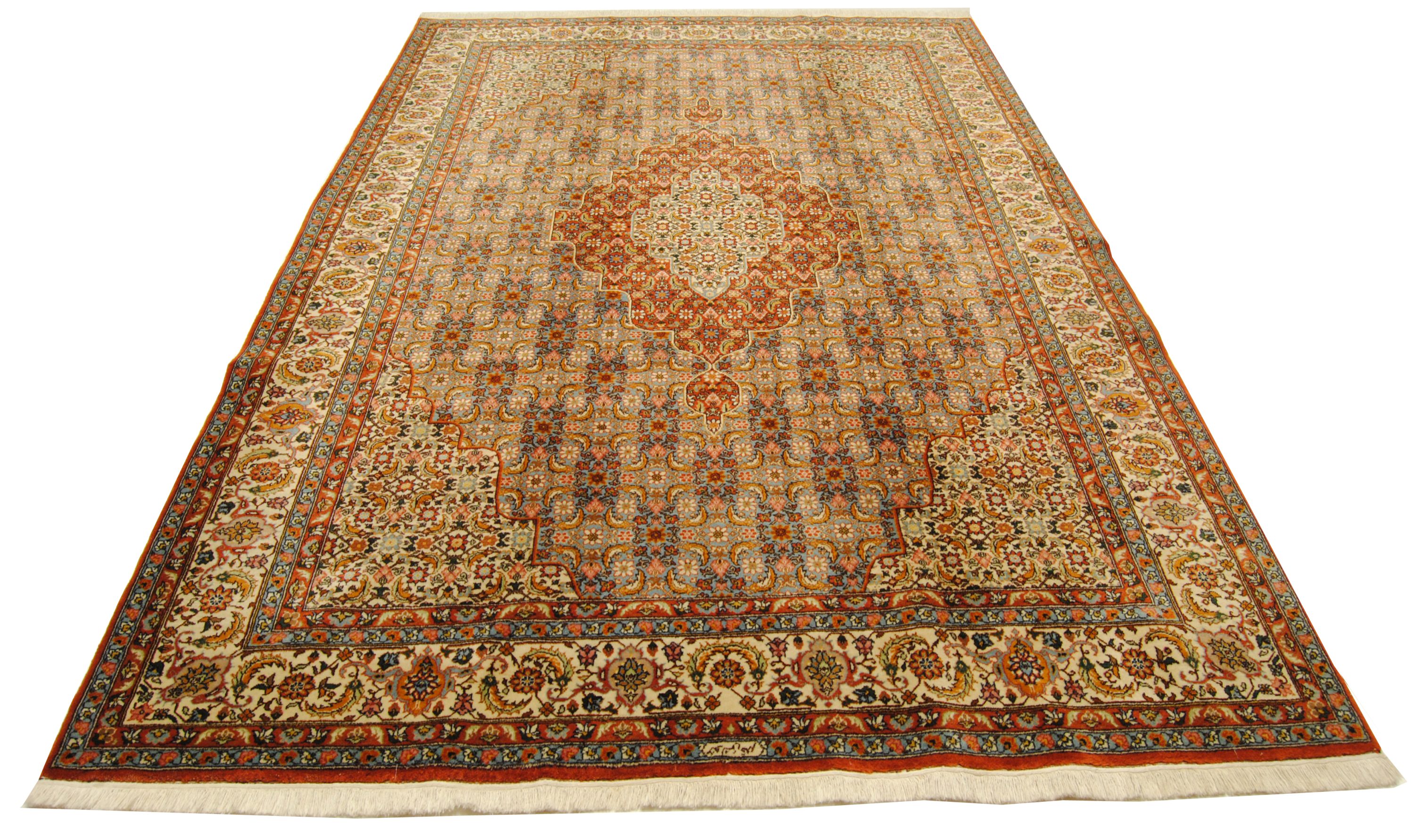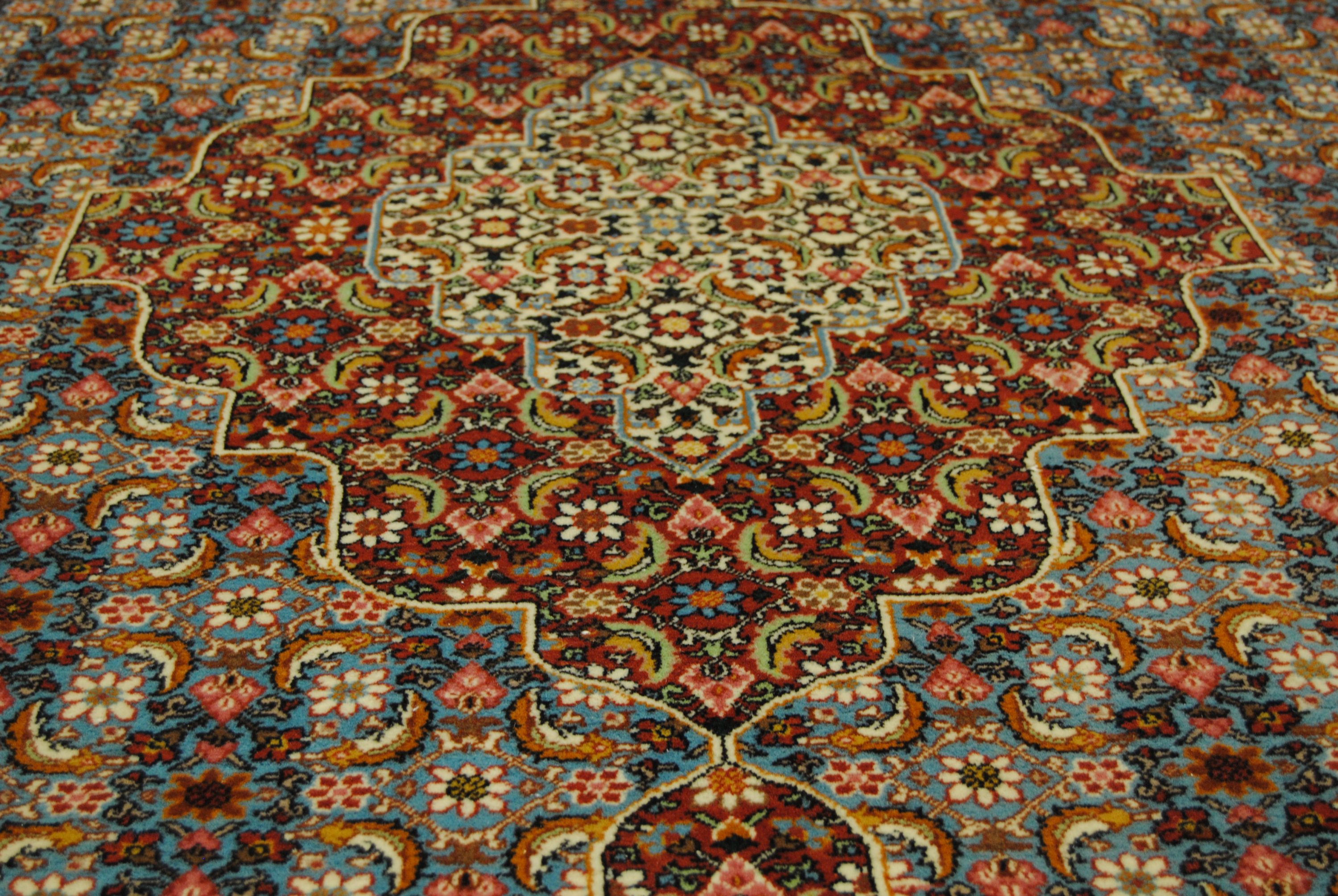 Dies ist ein handgeknüpfter Muresch-Teppich aus natürlichen Materialien. Unvollkommenheiten in den Mustern und Formen machen diesen Teppich einzigartig und betonen seinen authentischen und traditionellen Charakter.