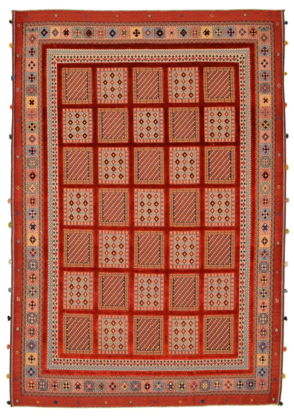 Nimbaft bedeuted auf persische „halbgeknüpft“, sie sind teils gewebt, teils geknüpft. Diese hochklassigen Zeugnisse authentischer Handwerkskunst stammen von den Dorfwerkstätten aus dem südpersischen Raum um Schiraz. Sie werden mit besten Farb- und Wollmaterialen geknüpft und erzählen in Symbolen die Lebensgeschichten Ihrer Urheber und deren Vorfahren.