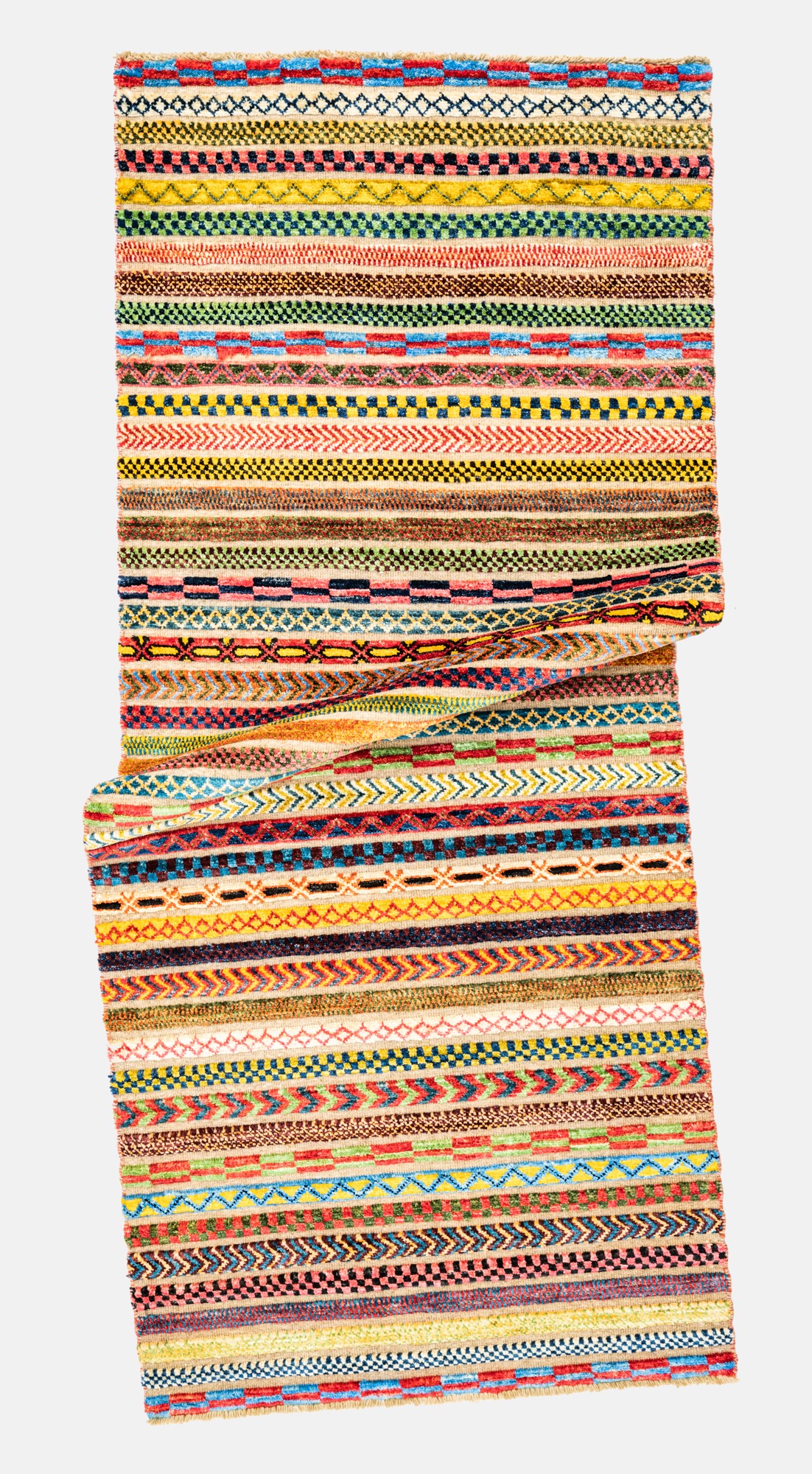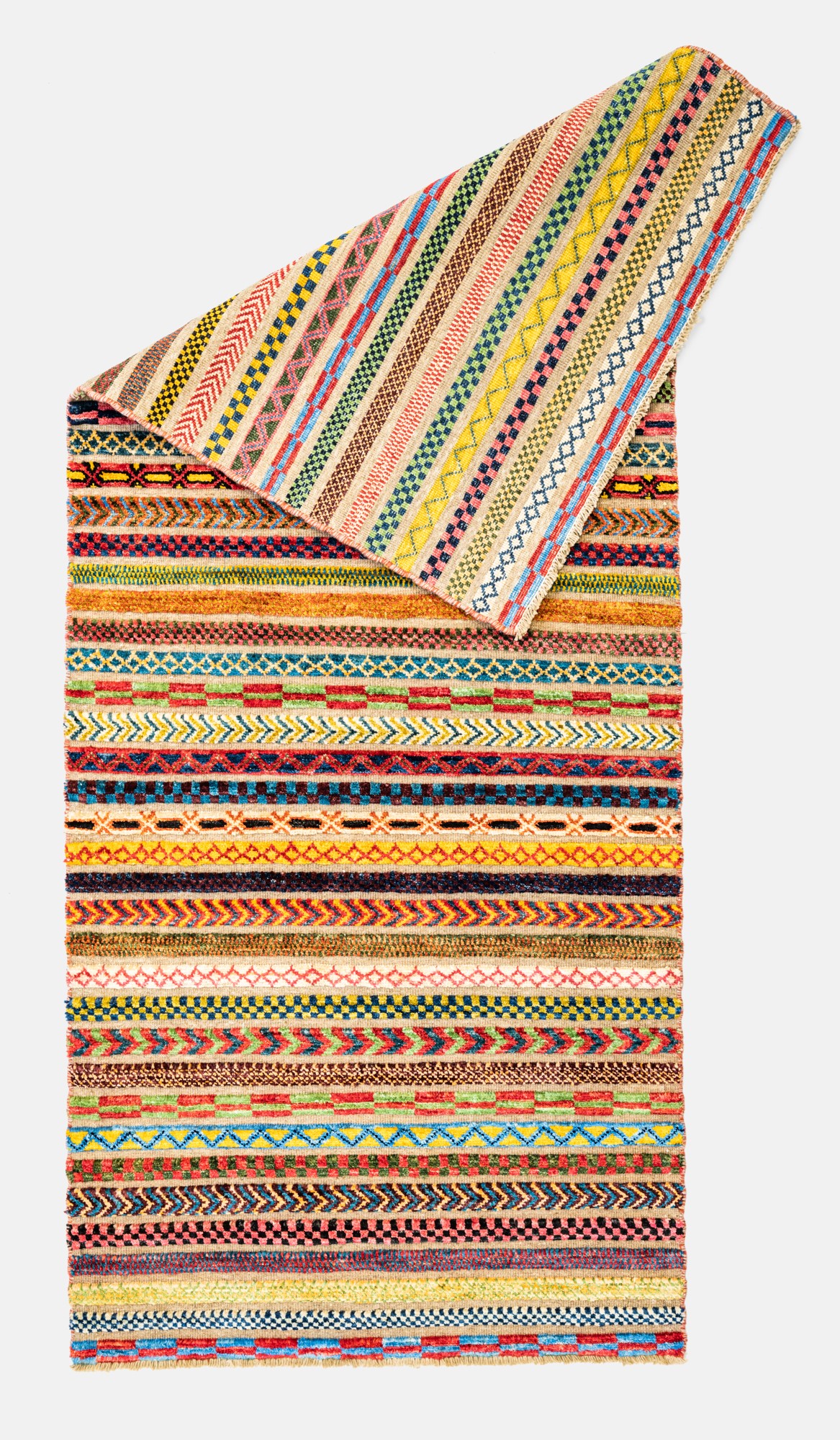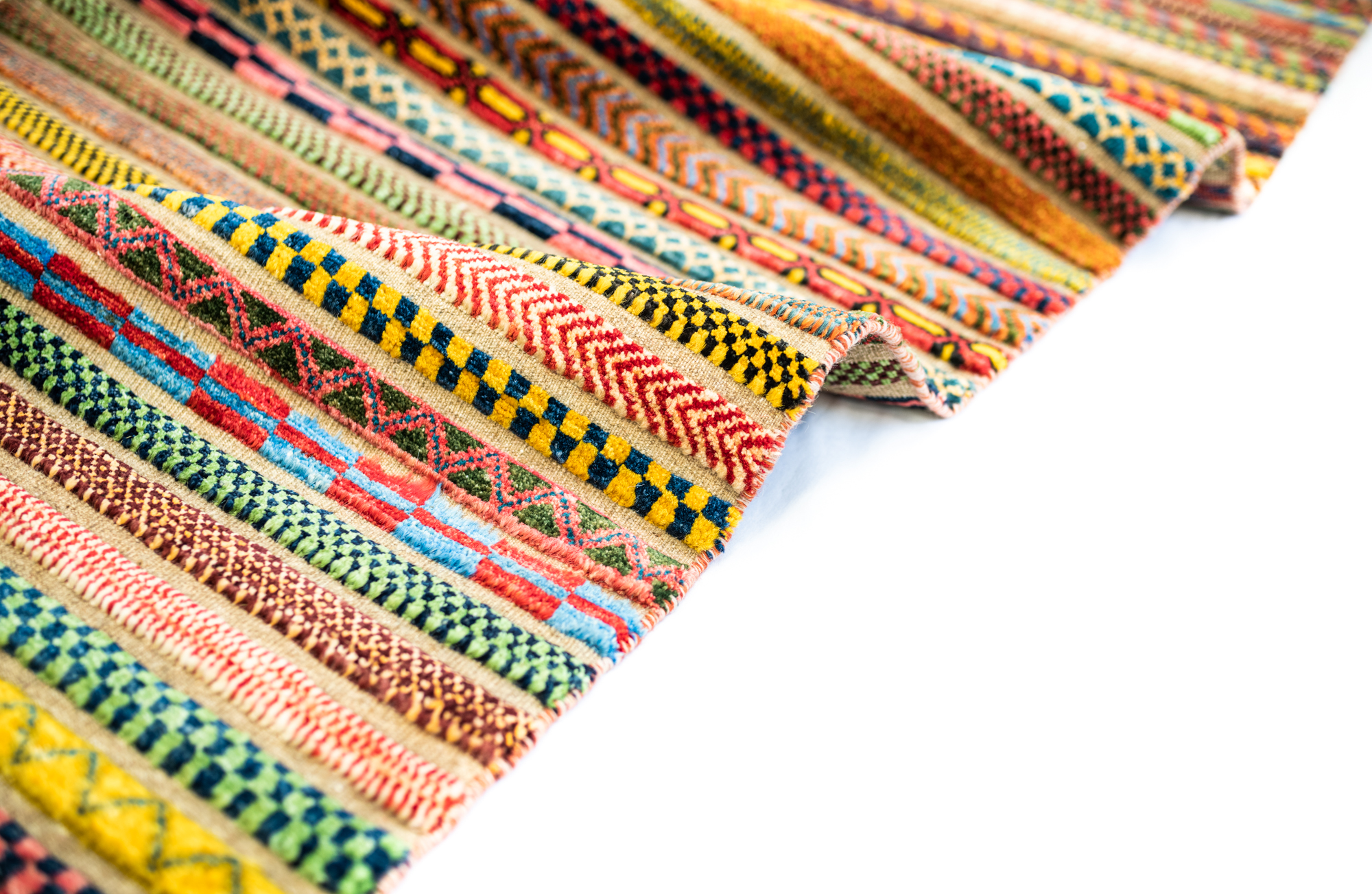 Die Hazara-Nimbaft-Honar-Kollektion besticht vorrangig durch ihr modernes, farbenfrohes Streifen-Design als auch durch die interessante Low-High Knüpftechnik: Nimbaft bedeutet auf persische halb geknüpft und halb gewebt.