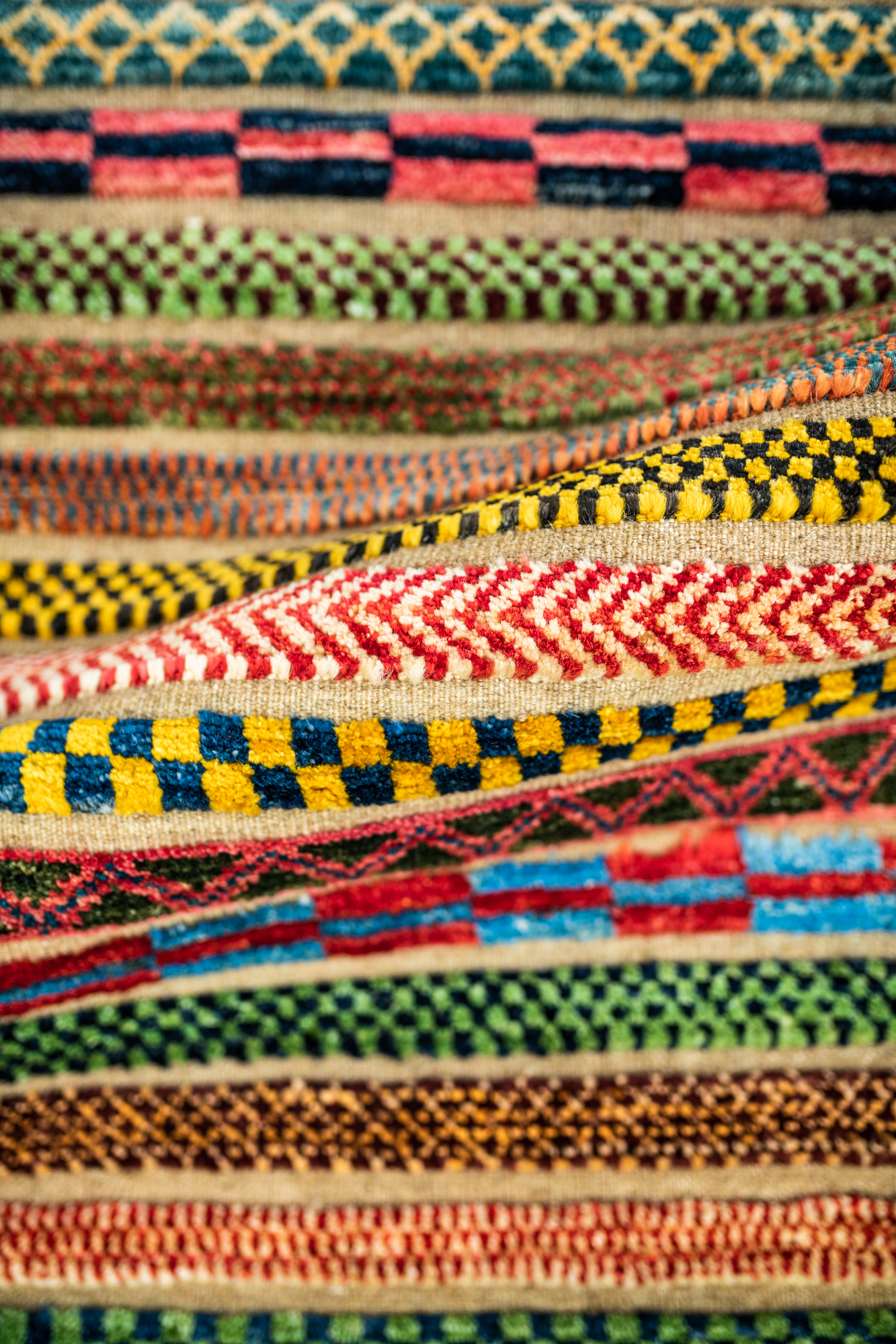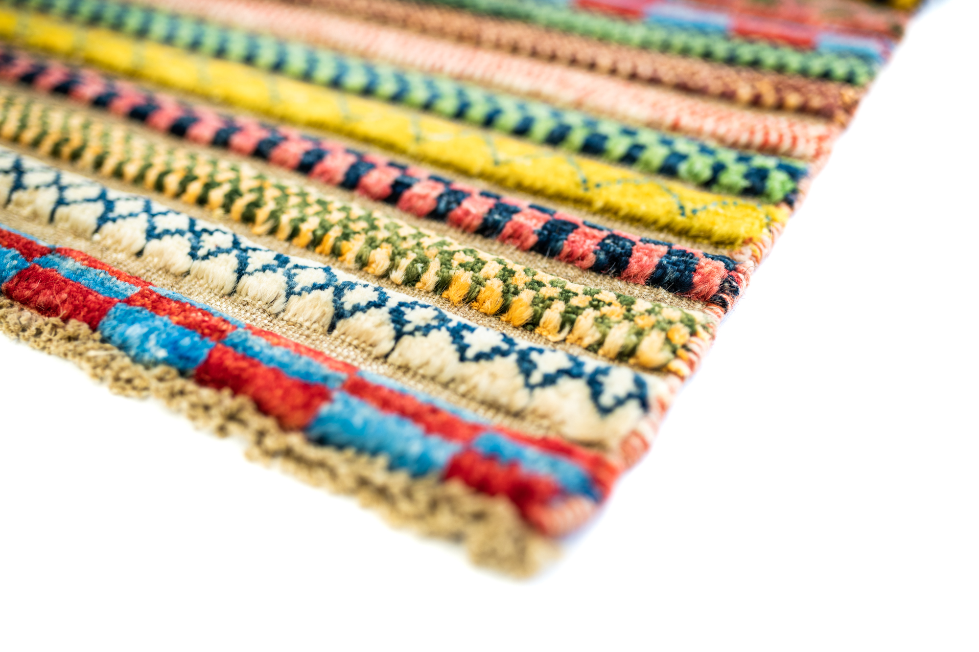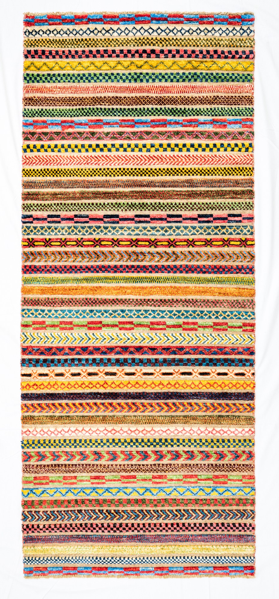 Die Hazara-Nimbaft-Honar-Kollektion besticht vorrangig durch ihr modernes, farbenfrohes Streifen-Design als auch durch die interessante Low-High Knüpftechnik: Nimbaft bedeutet auf persische halb geknüpft und halb gewebt.