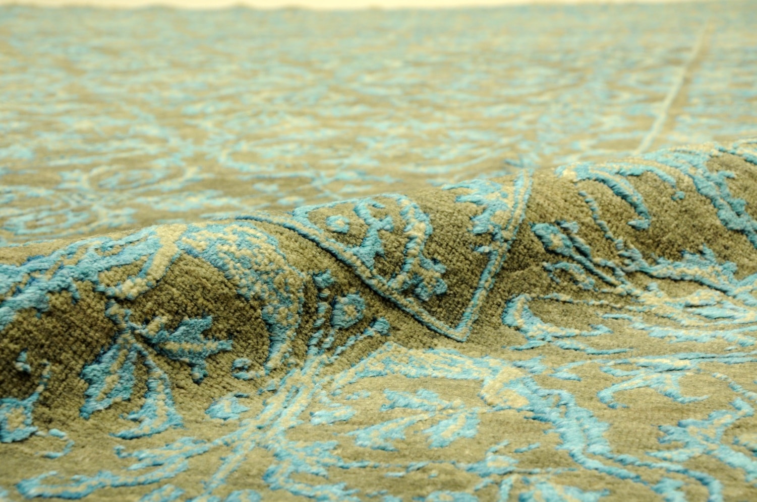Samina HONAR stammen aus einer Designer-Werkstatt in Mittelindien und verstehen sich als Hommage an die Hochblüte der floralen Teppichkunst. Ein Edelmaterialmix aus Bambuskunstseide und Schafwolle verleiht den Teppichen ihre einzigartige Optik.