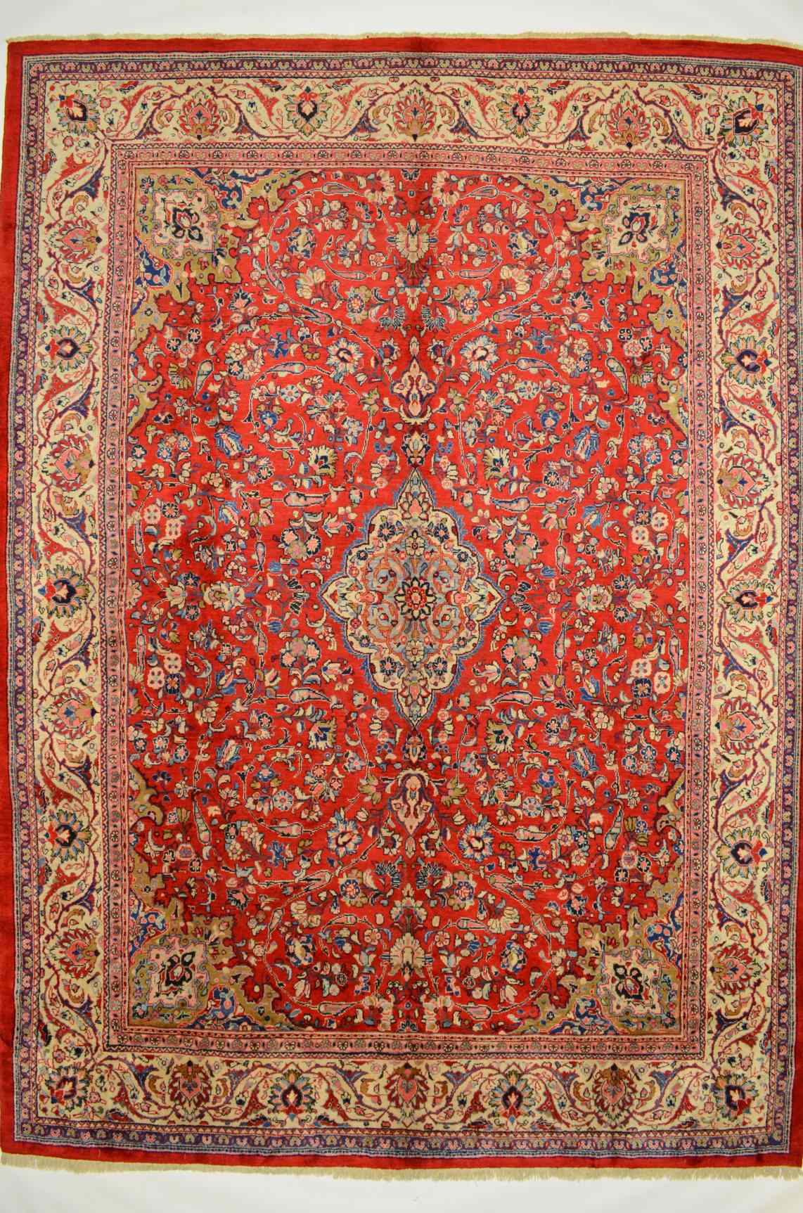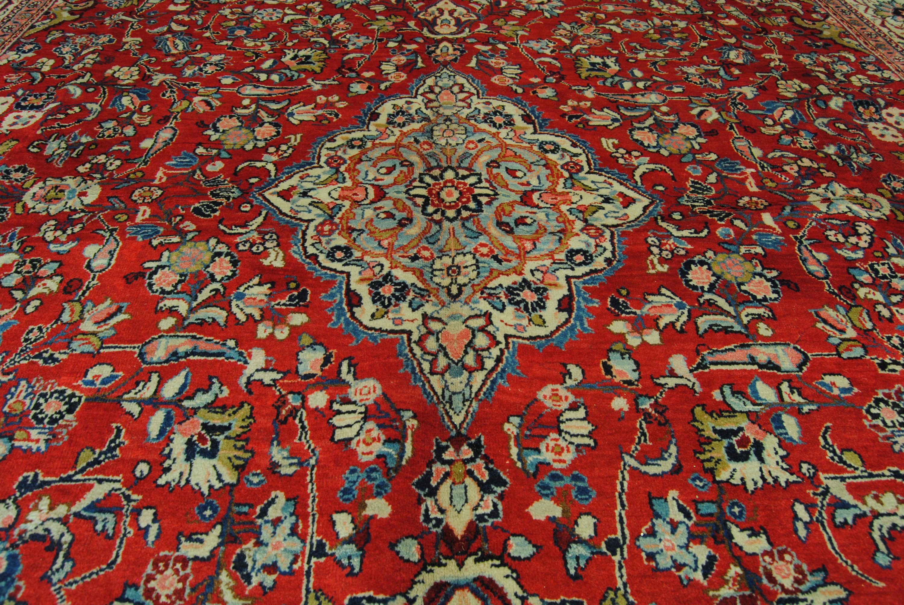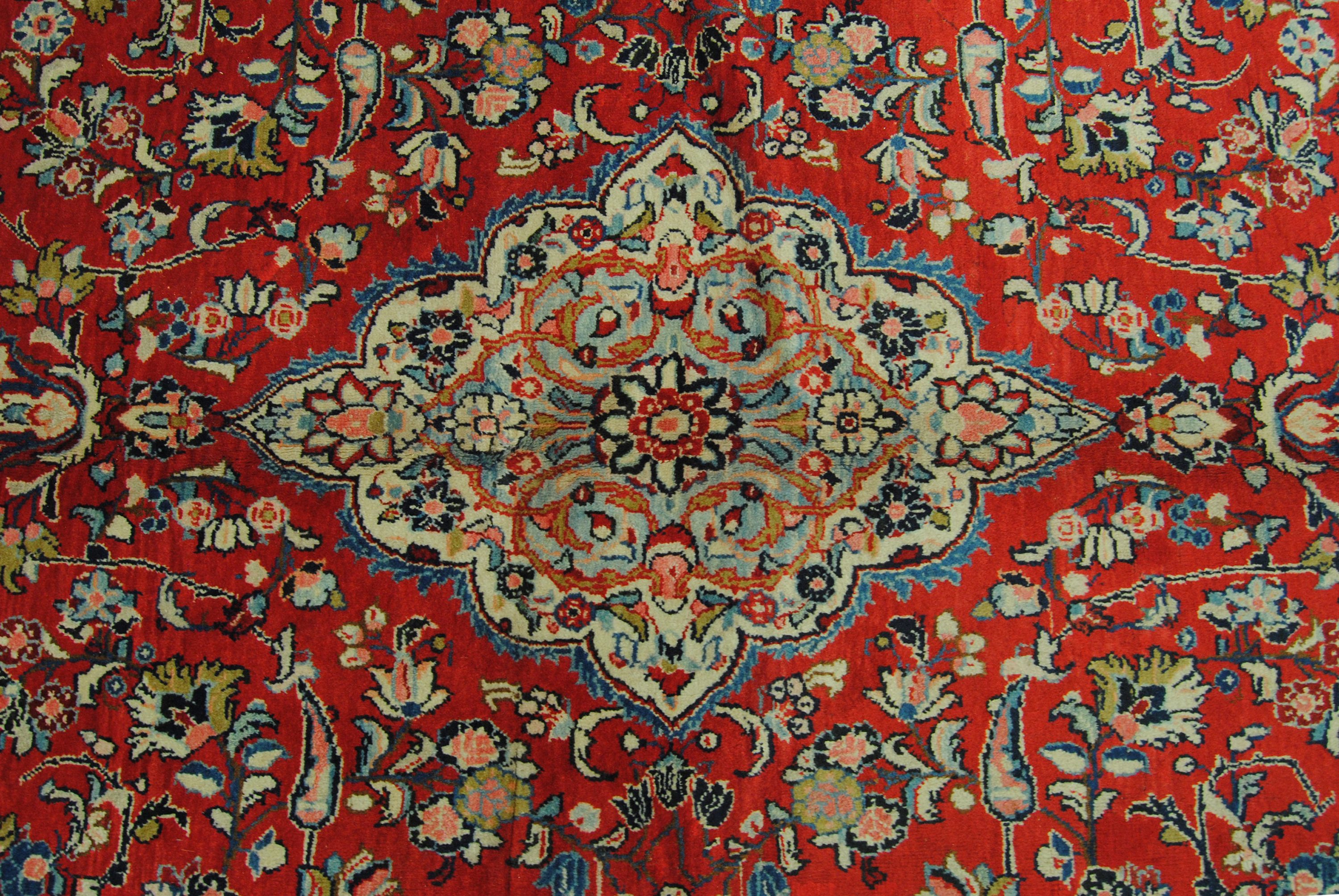 Sarough-Teppiche zeichnen sich vor allem durch ihre außergewöhnlich geschmeidige, fettreiche und somit widerstandsfähige Wolle, durch Ihre harmonische, meist florale Musterarchitektur als auch durch Ihre gediegene Farbzusammenstellung aus.