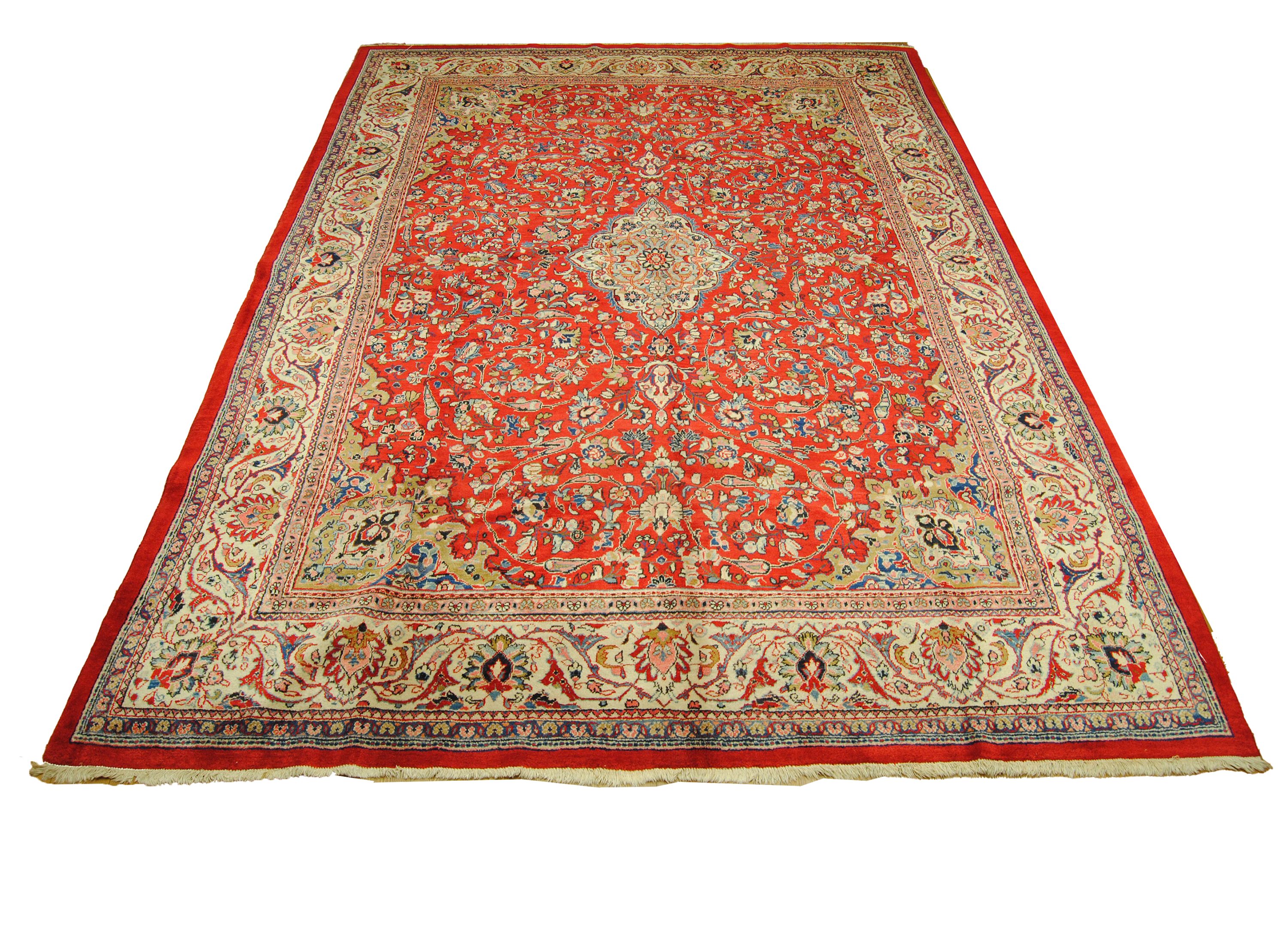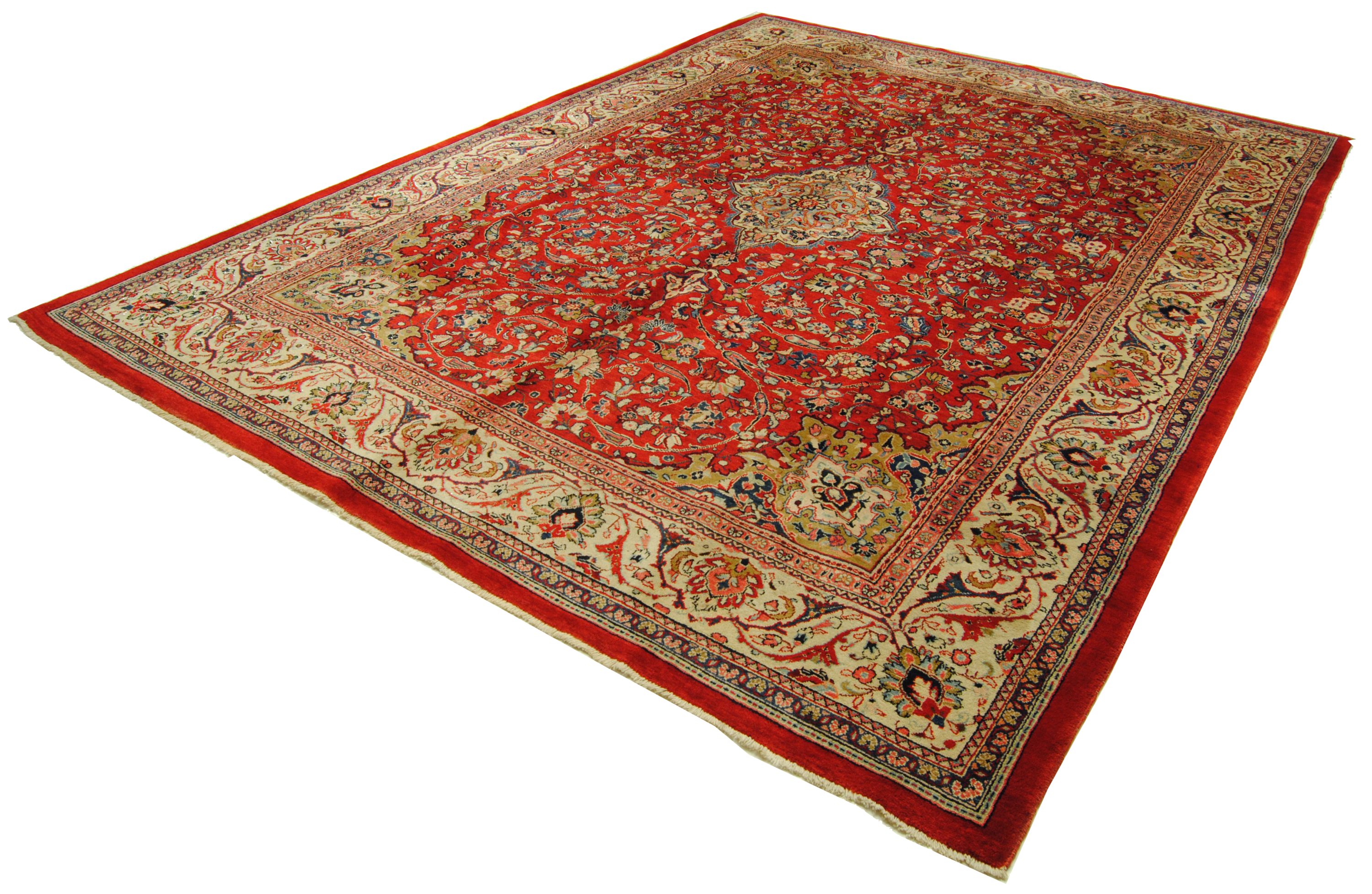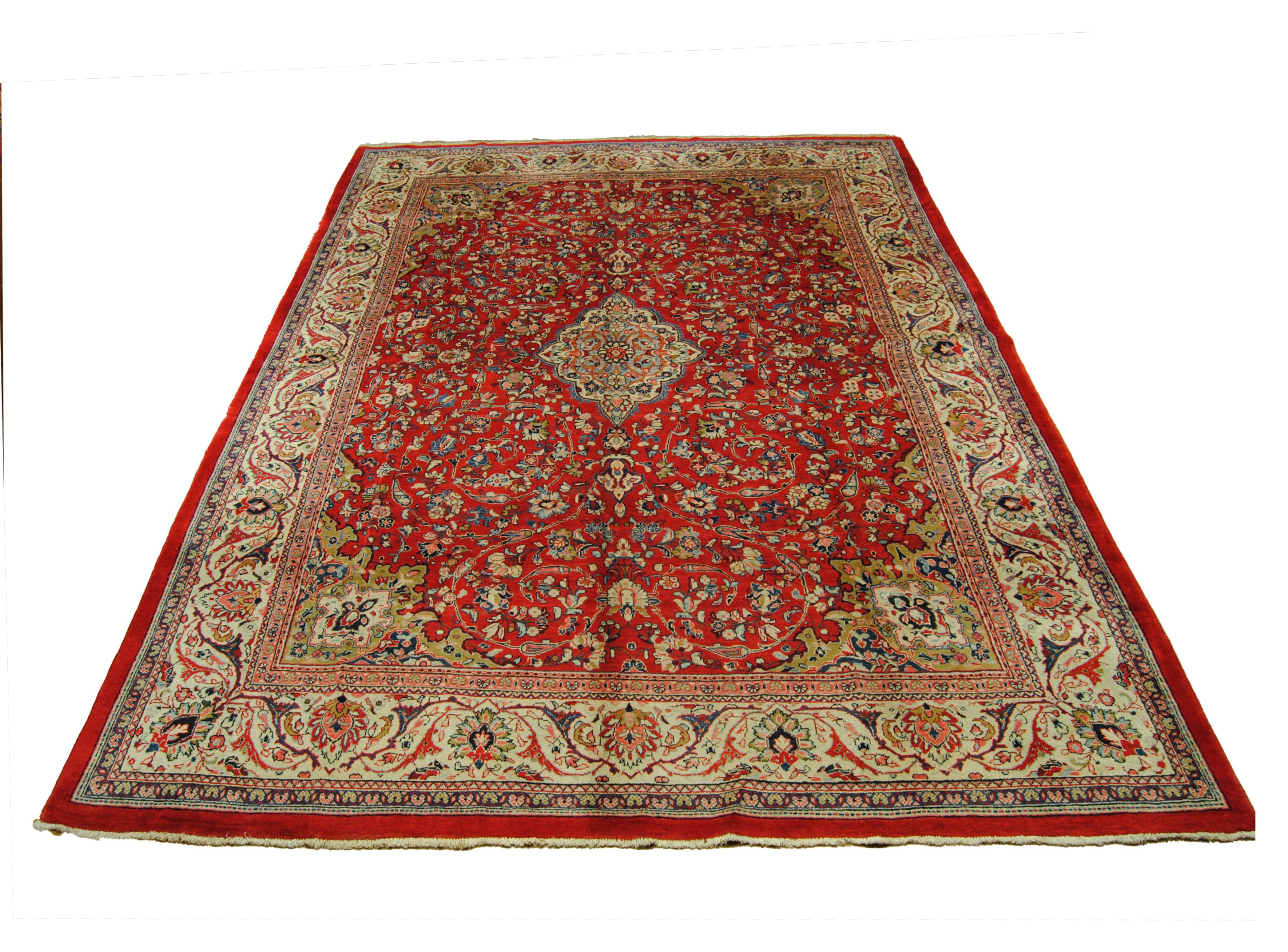 Sarough-Teppiche zeichnen sich vor allem durch ihre außergewöhnlich geschmeidige, fettreiche und somit widerstandsfähige Wolle, durch Ihre harmonische, meist florale Musterarchitektur als auch durch Ihre gediegene Farbzusammenstellung aus.